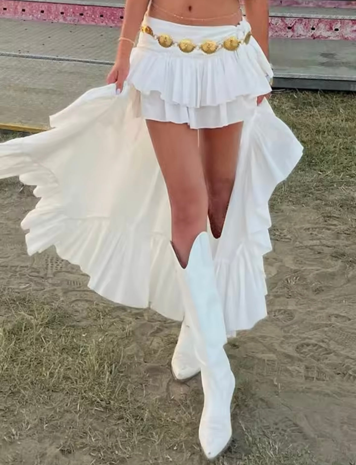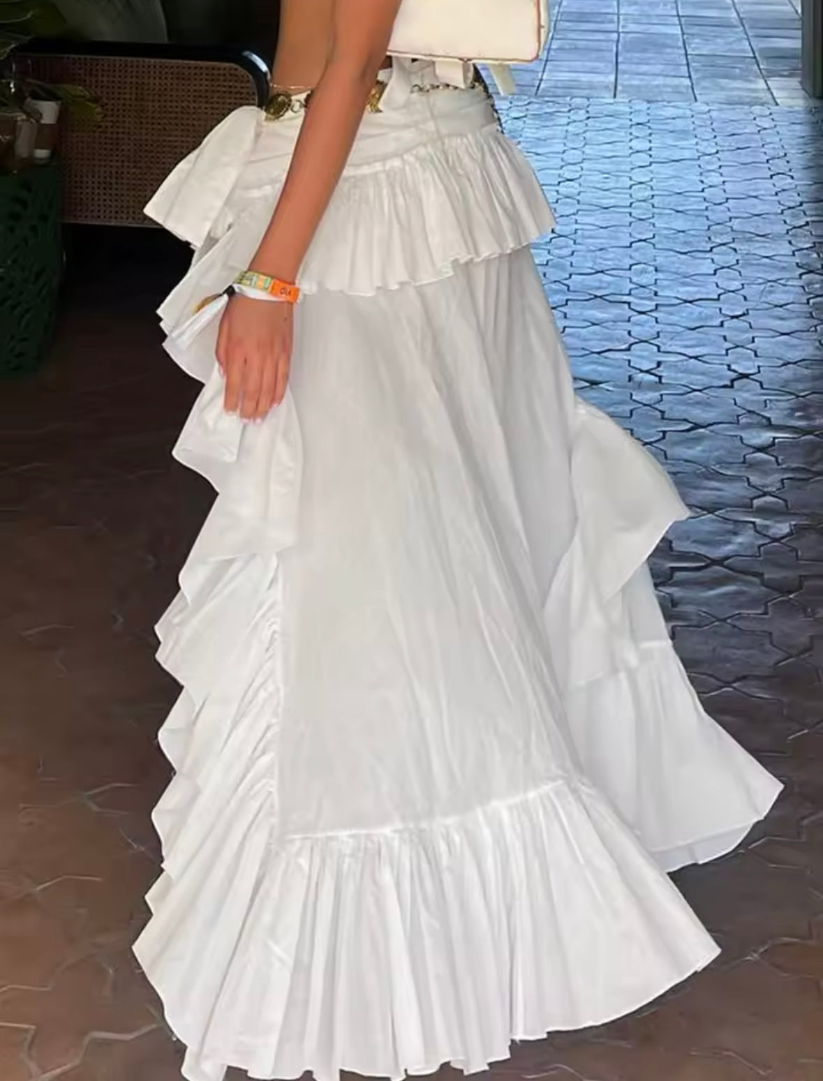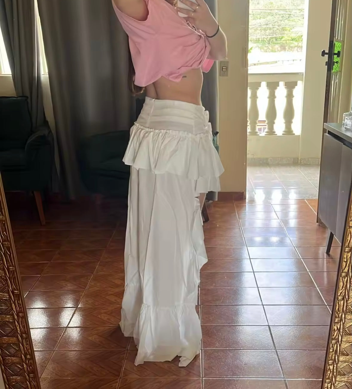 This asymmetric skirt features a unique design, with a shorter length in the front and a longer length in the back. This creates a striking asymmetry that is sure to turn heads. With the perfect balance of style and functionality, this skirt is a must-have for any fashion-forward individual.