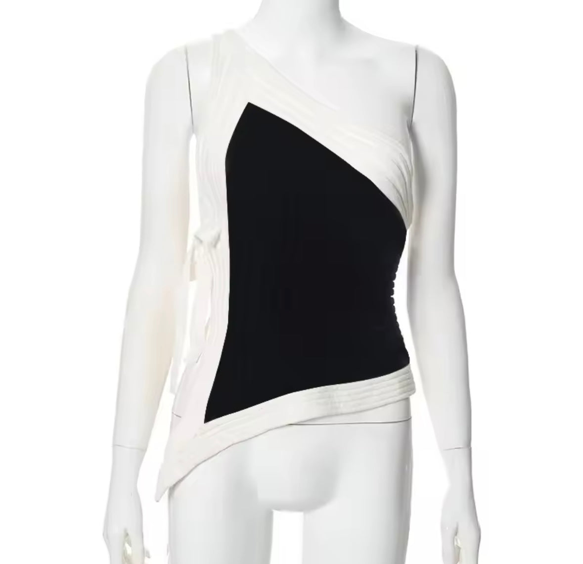Dress up your outfit with this stylish black and white asymmetric top. The unique design adds a modern edge while the color contrast offers a classic touch. Made with high-quality materials, this top is both comfortable and fashionable. Perfect for any occasion.