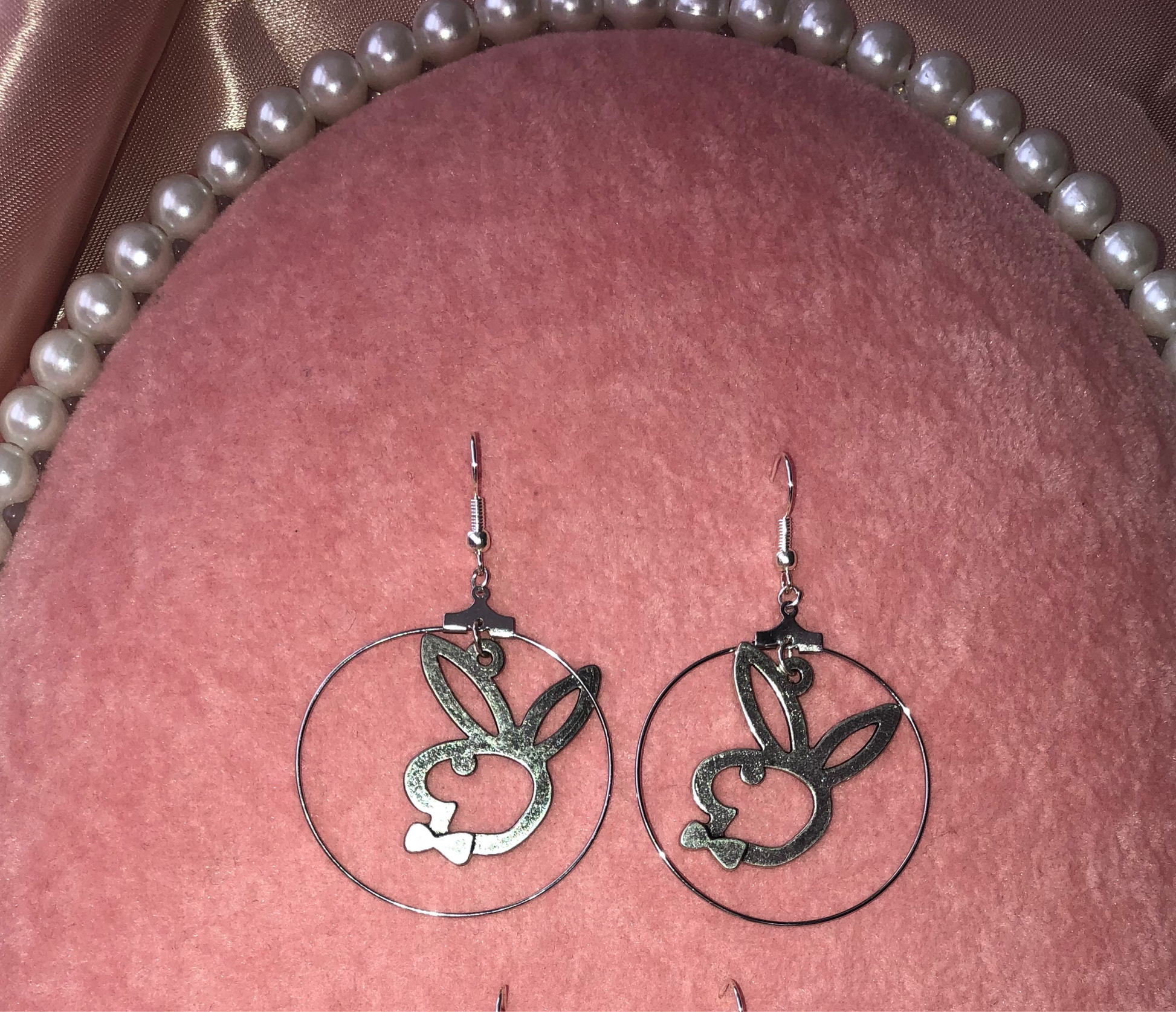 Beautiful handmade Playboy inspired hoop earrings with bunny pendant details.