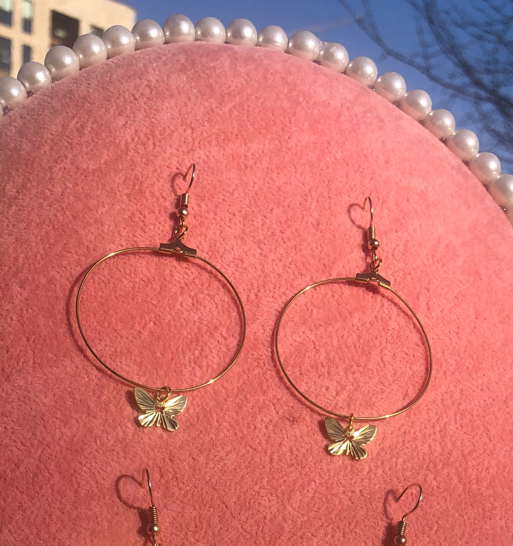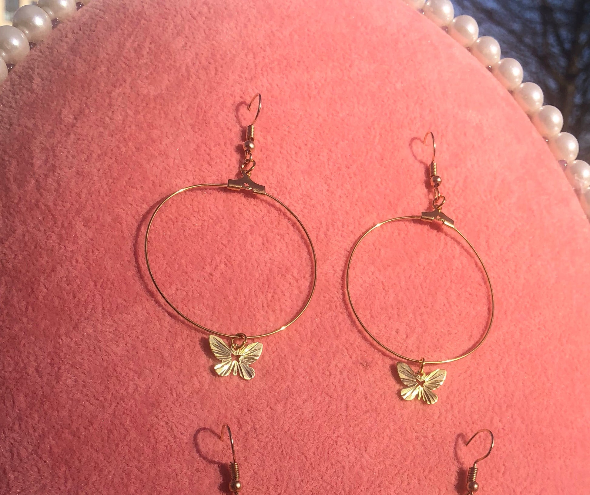 Beautiful handmade hoop earrings with cute butterfly pendant details.
