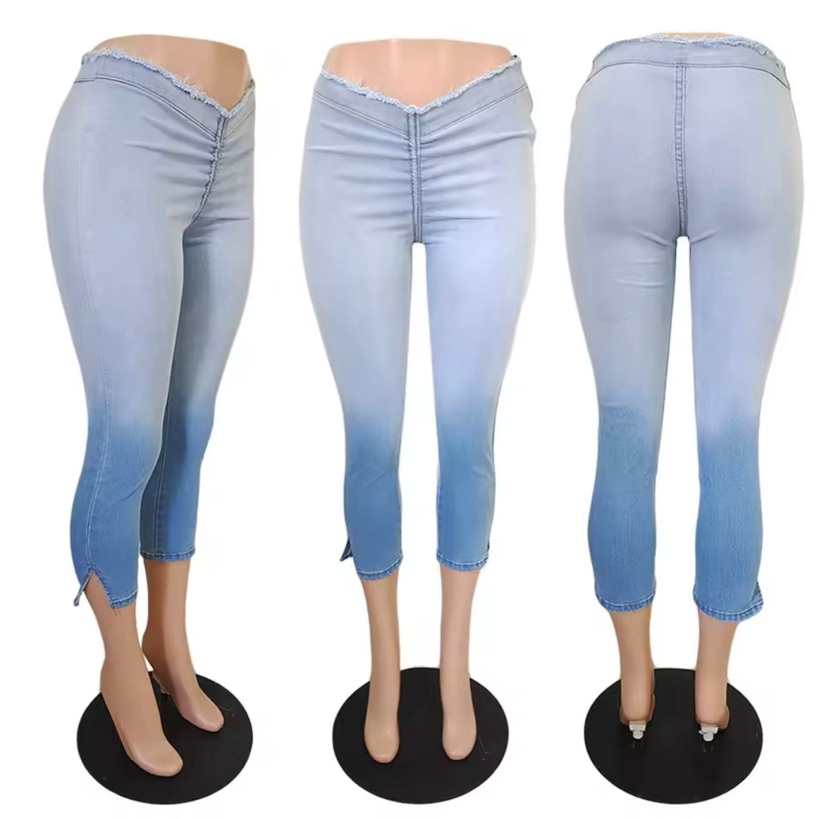These Capri low cut jeans offer a trendy and flattering fit, perfect for any casual outing. The low cut design provides a slimming effect while the capri length keeps you cool in warm weather.