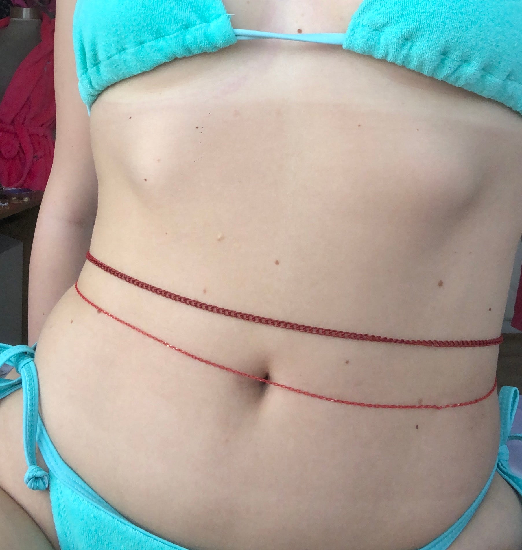 Beautiful handmade belly chain available in: gold/champagne, gold/blue, pink and red