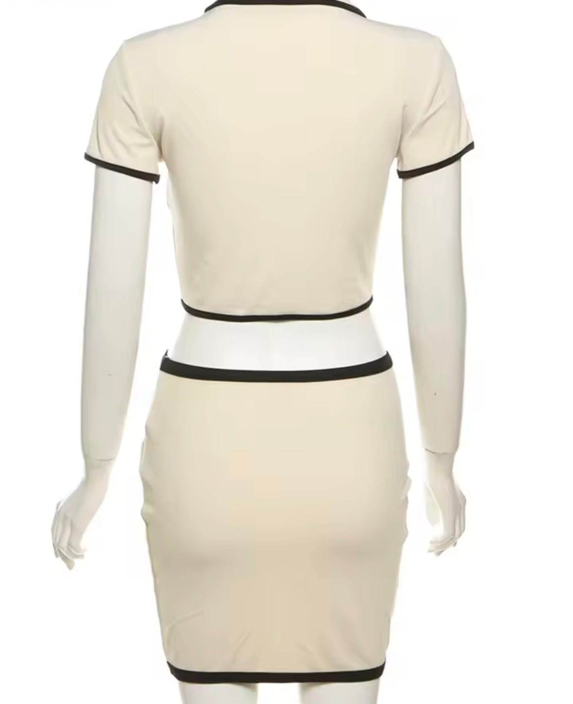 This contrast co ord set includes a mini skirt and crop top, perfect for a stylish and coordinated look. Elevate your wardrobe with this trendy addition.