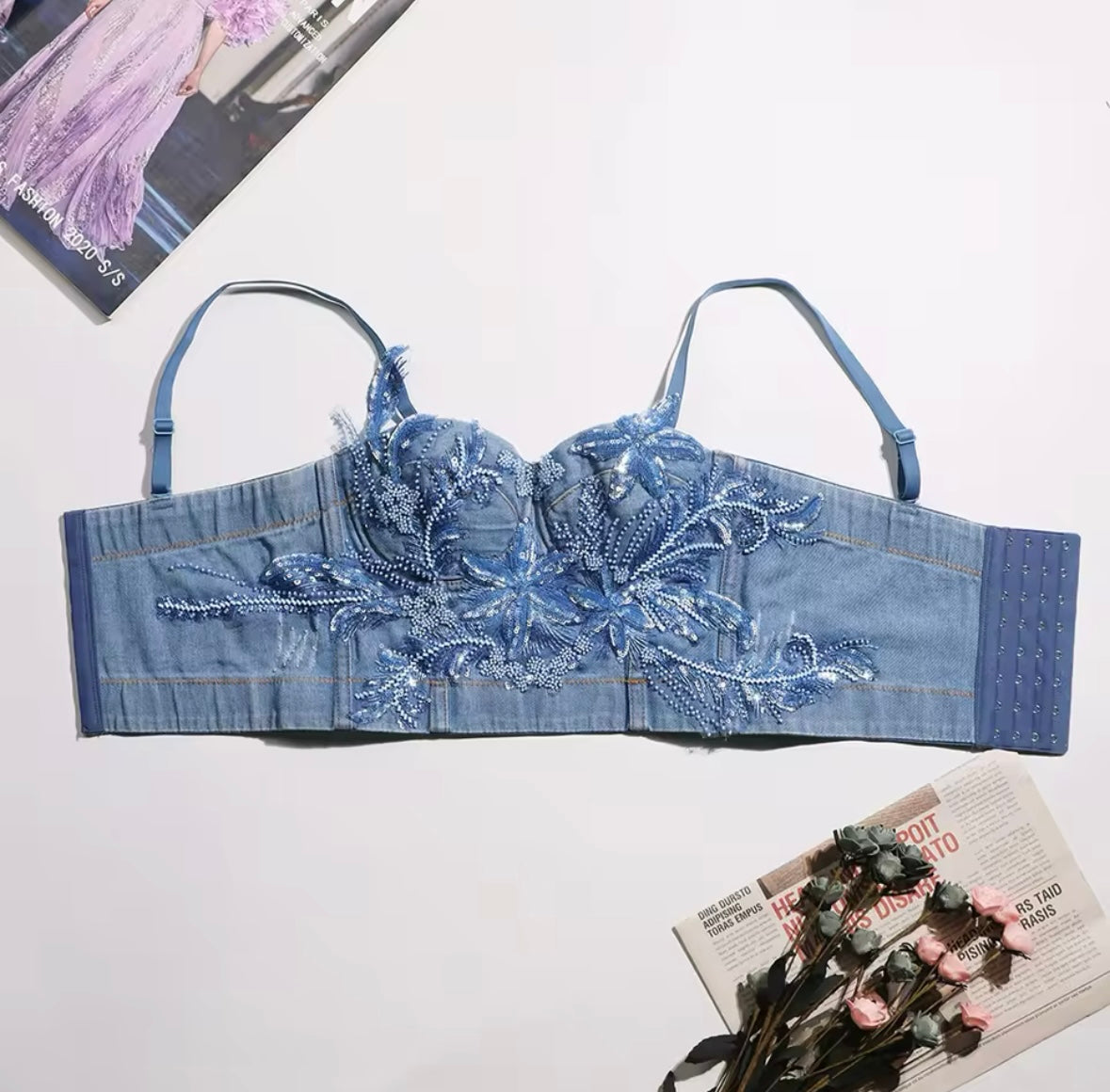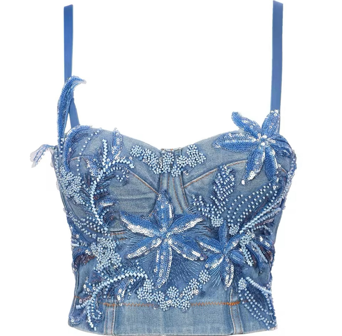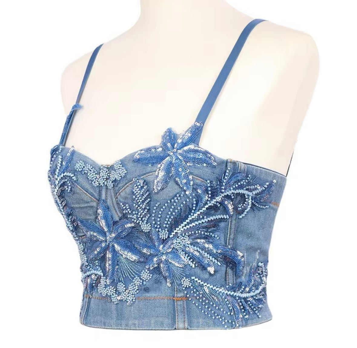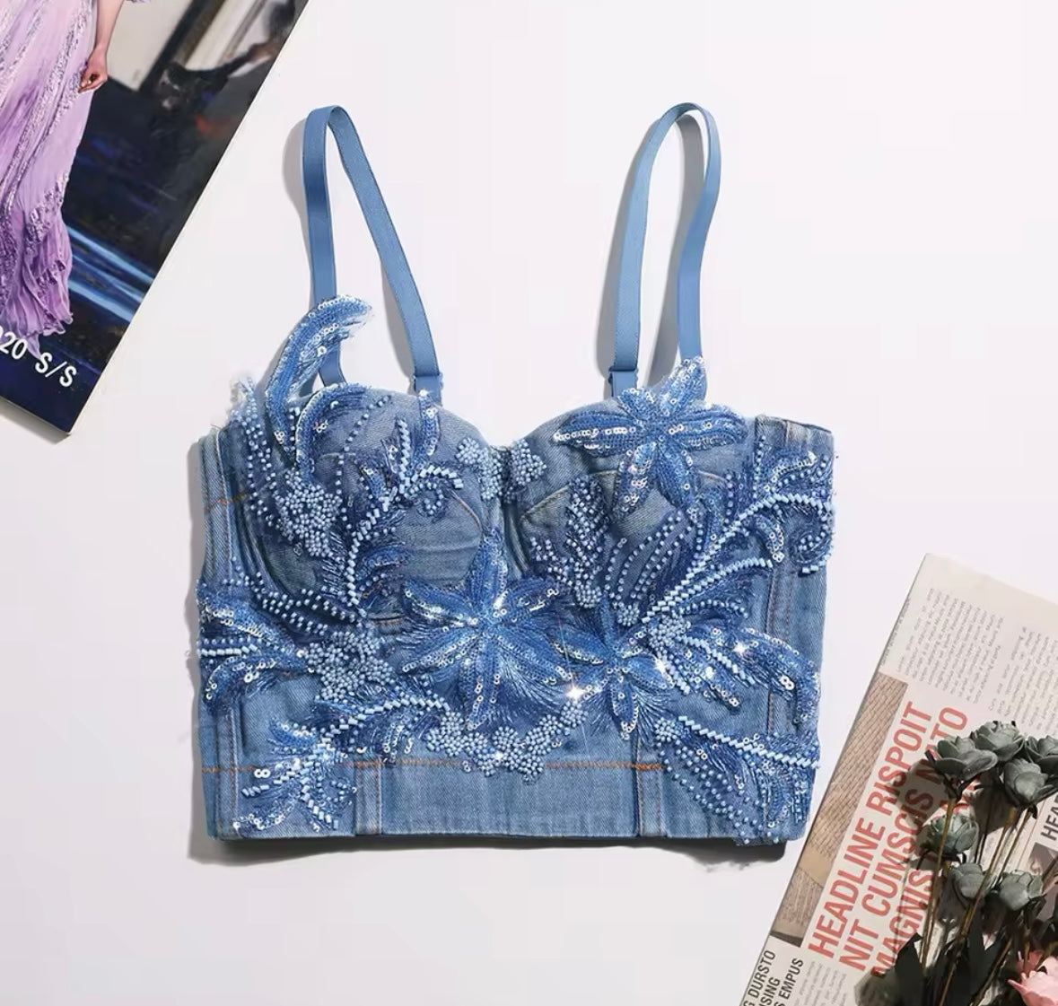 Upgrade your denim collection with our stylish Denim Sequin Crop Top. Crafted from blue denim and adorned with stunning sequin details, this crop top is the perfect addition to any fashion-forward wardrobe. Show off your unique style and stand out from the crowd with our one-of-a-kind top.
