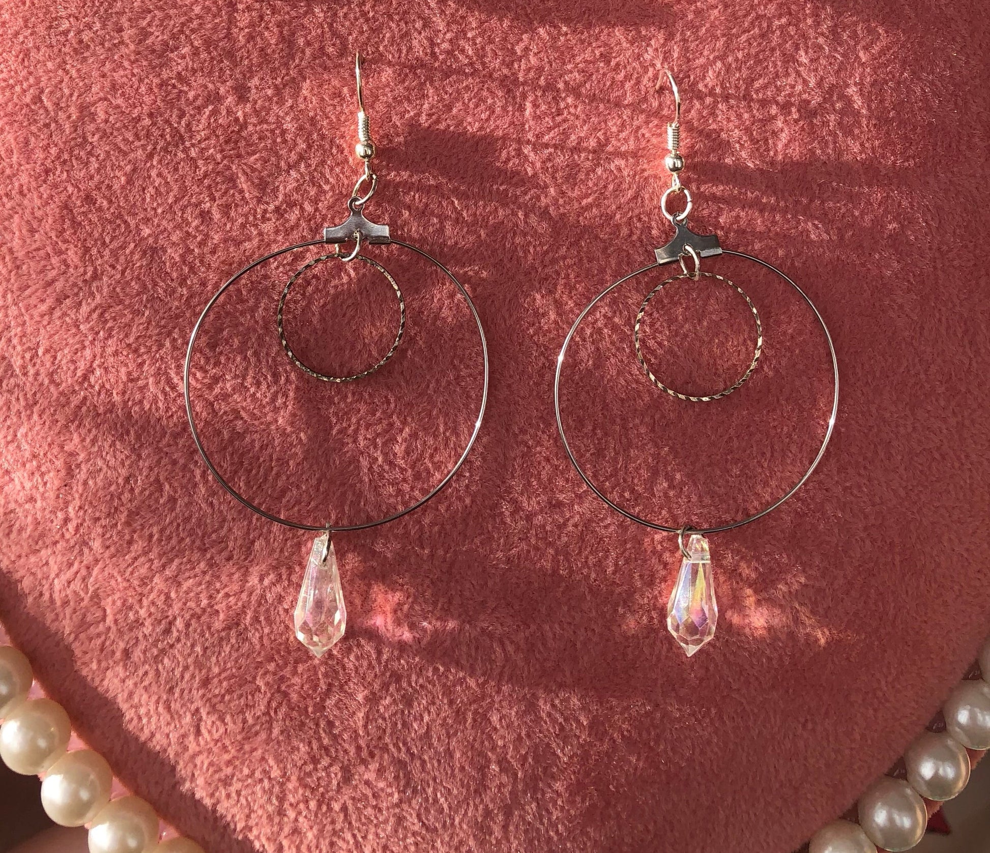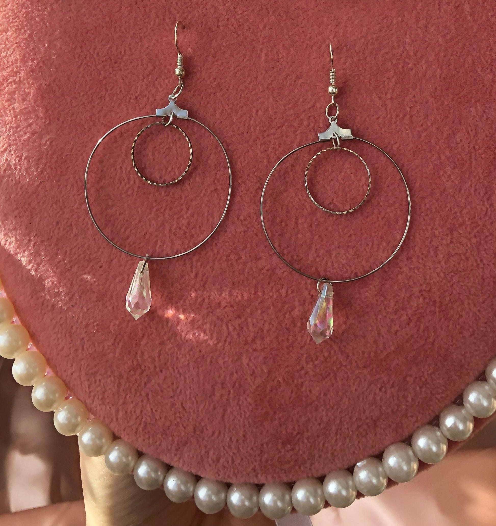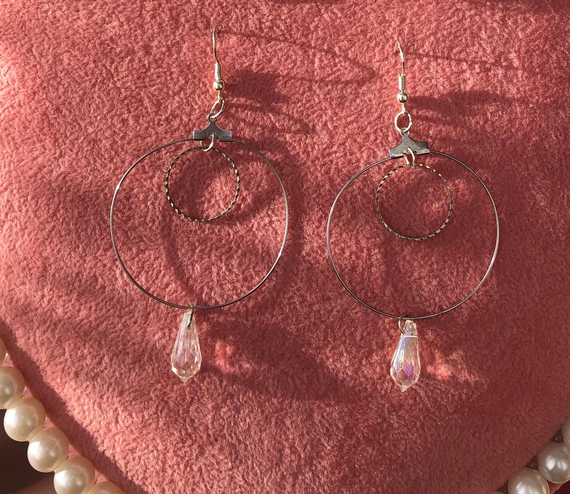Beautiful earrings with textured circles and crystal pendant details.