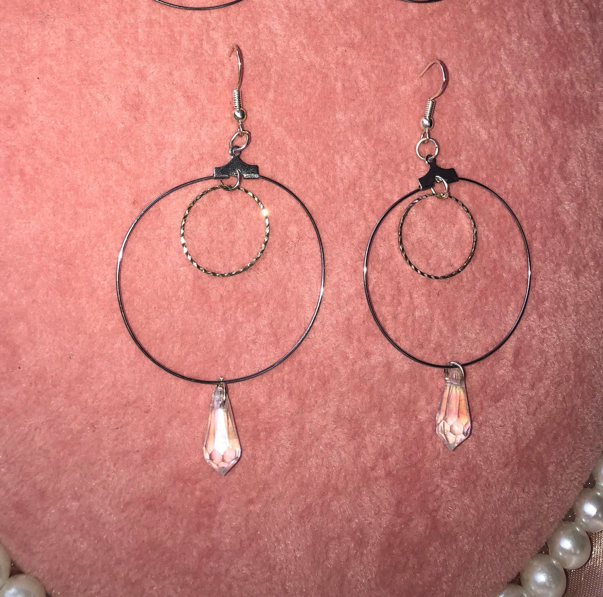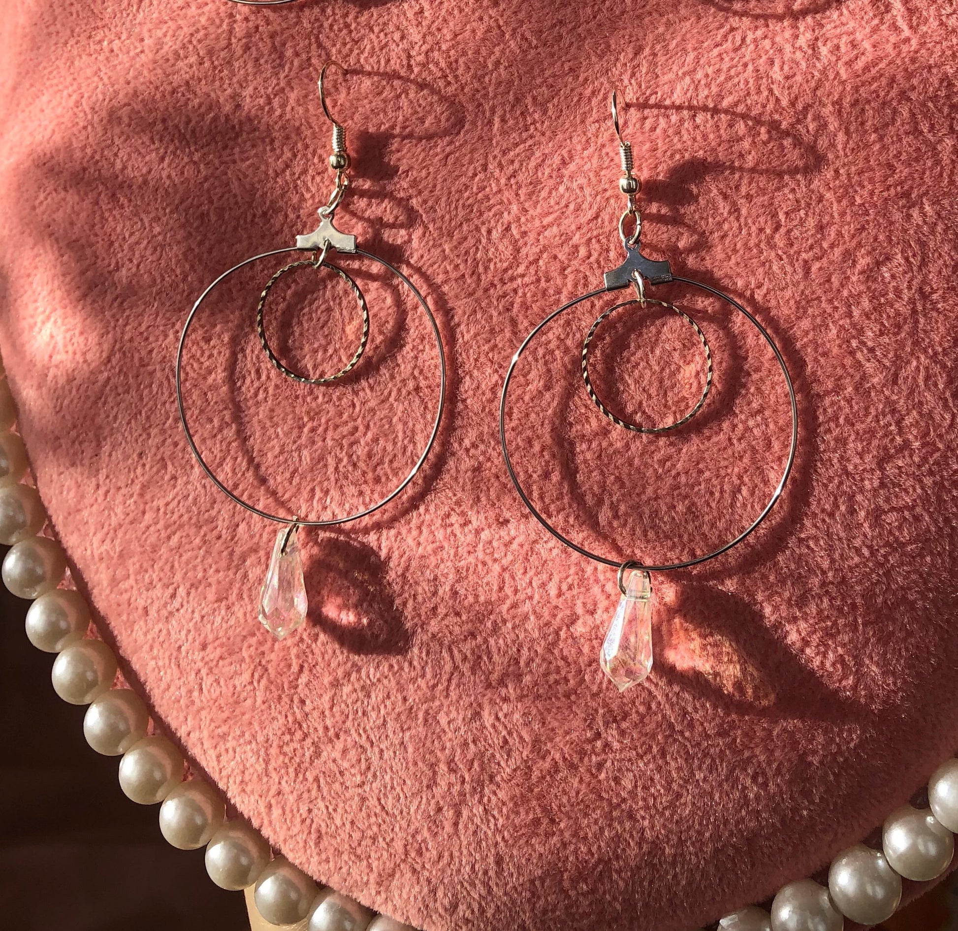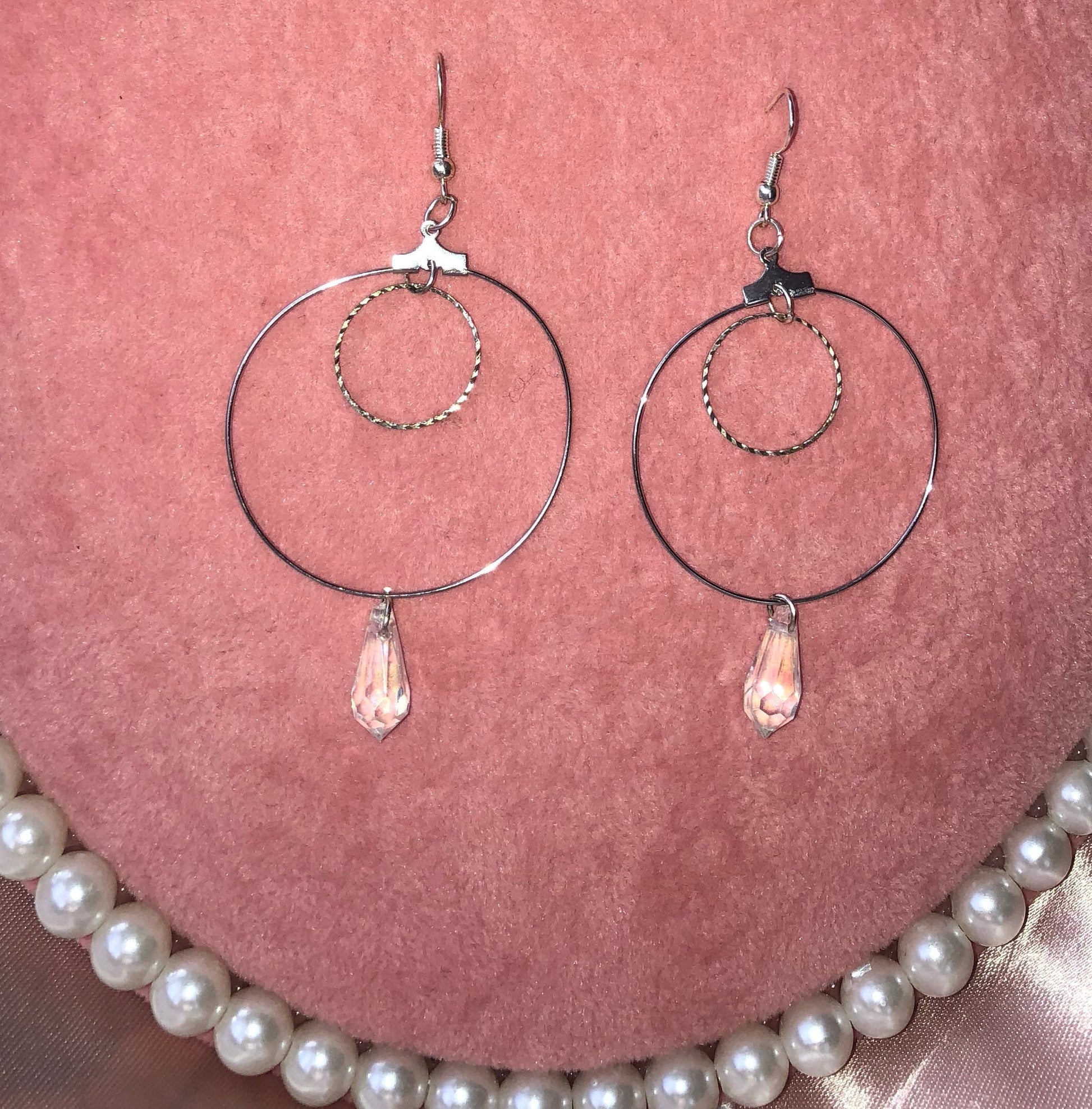 Beautiful earrings with textured circles and crystal pendant details.