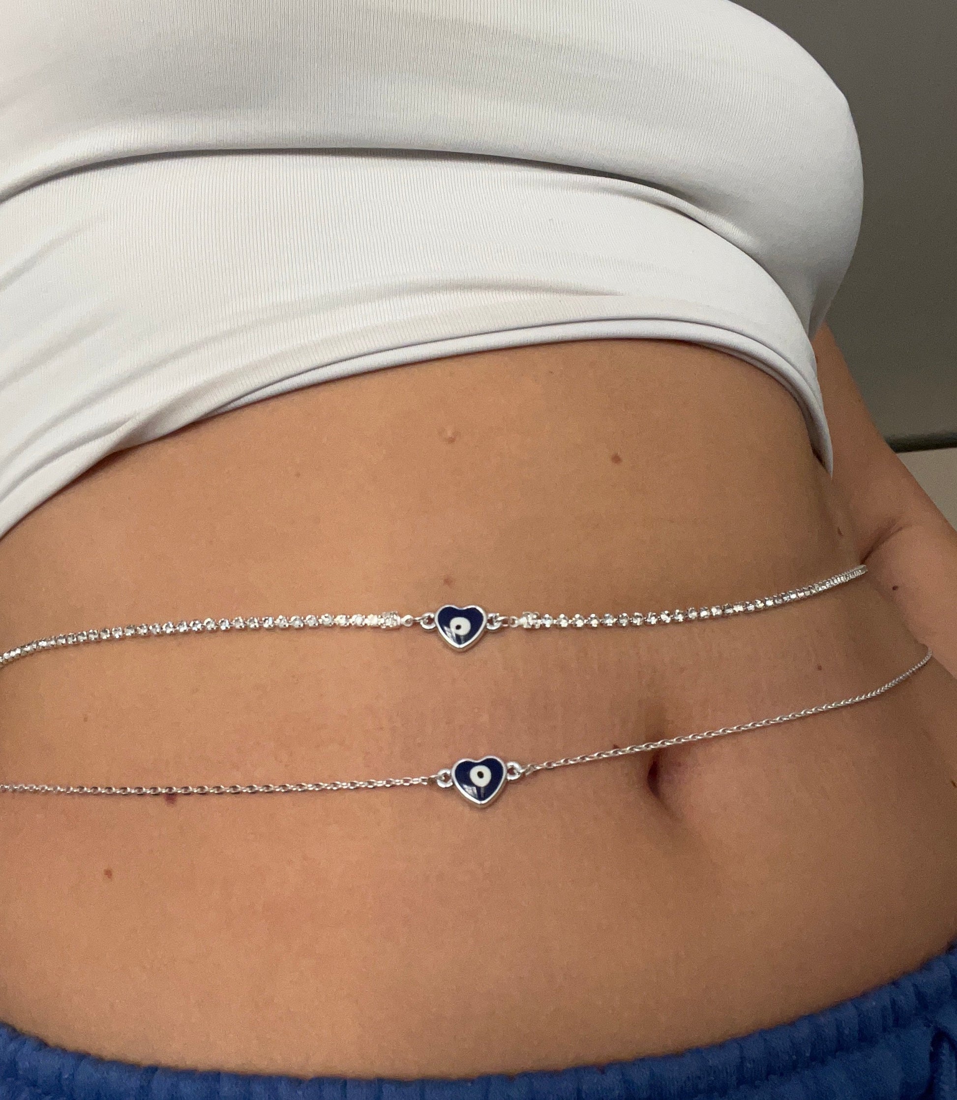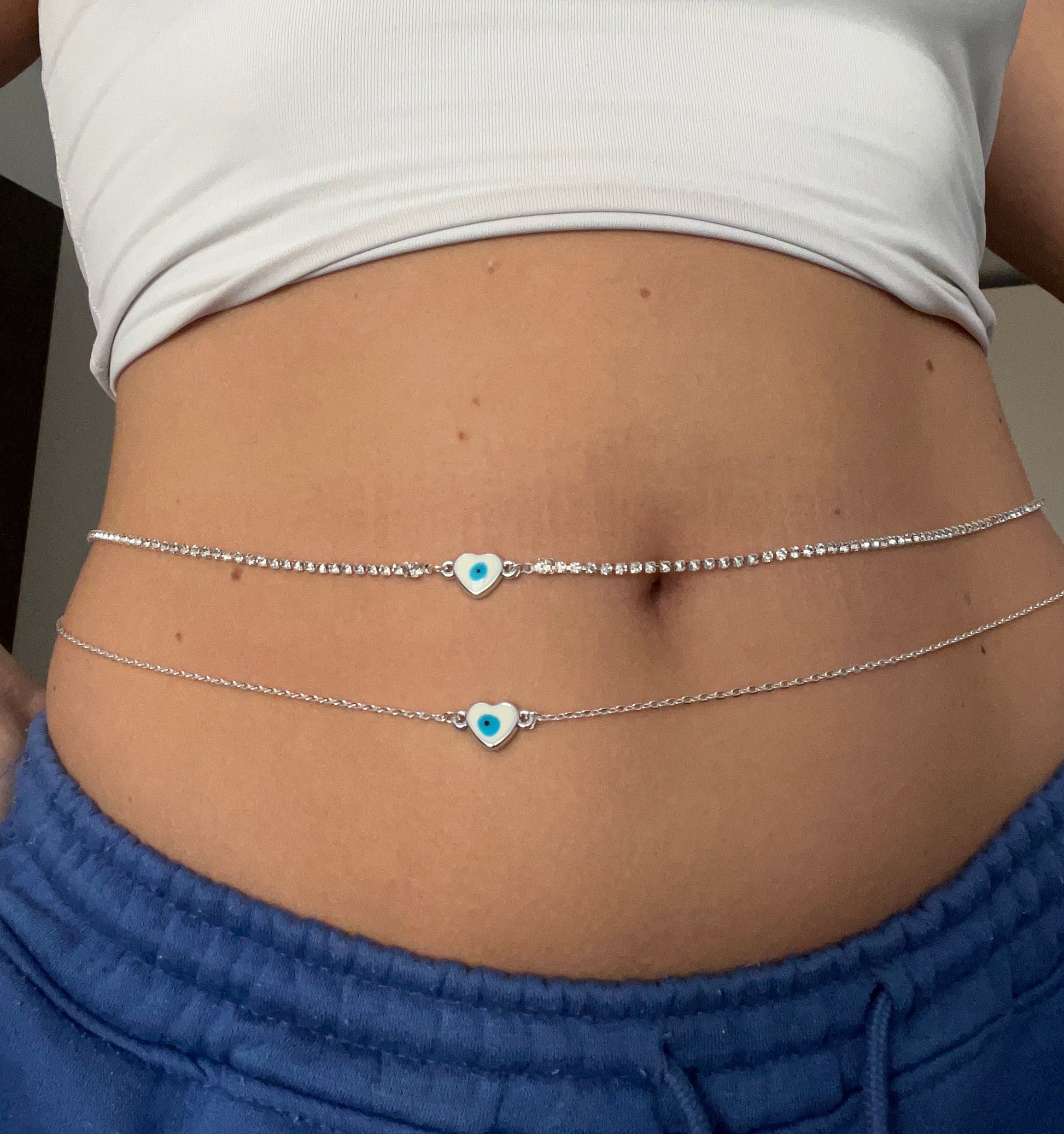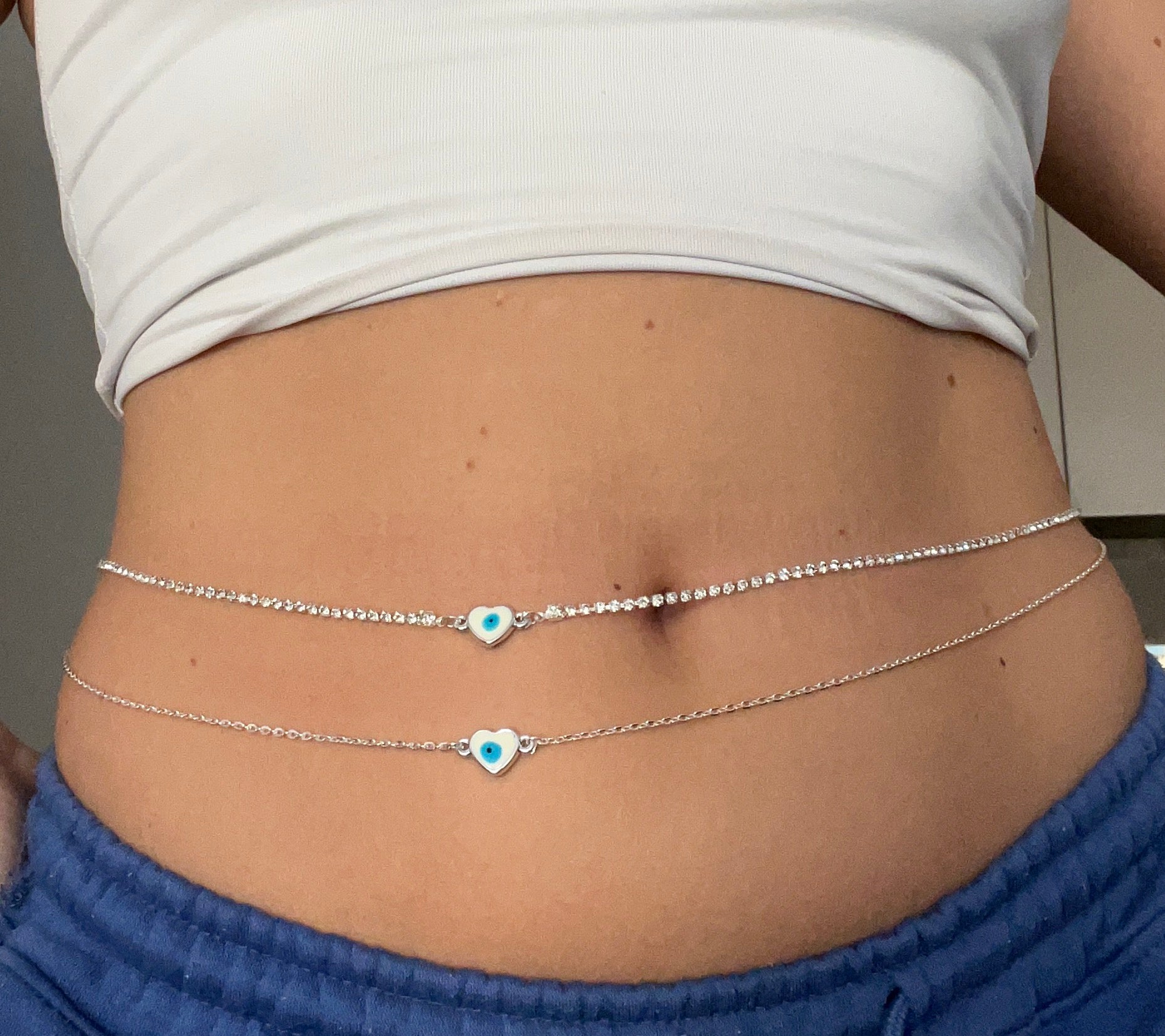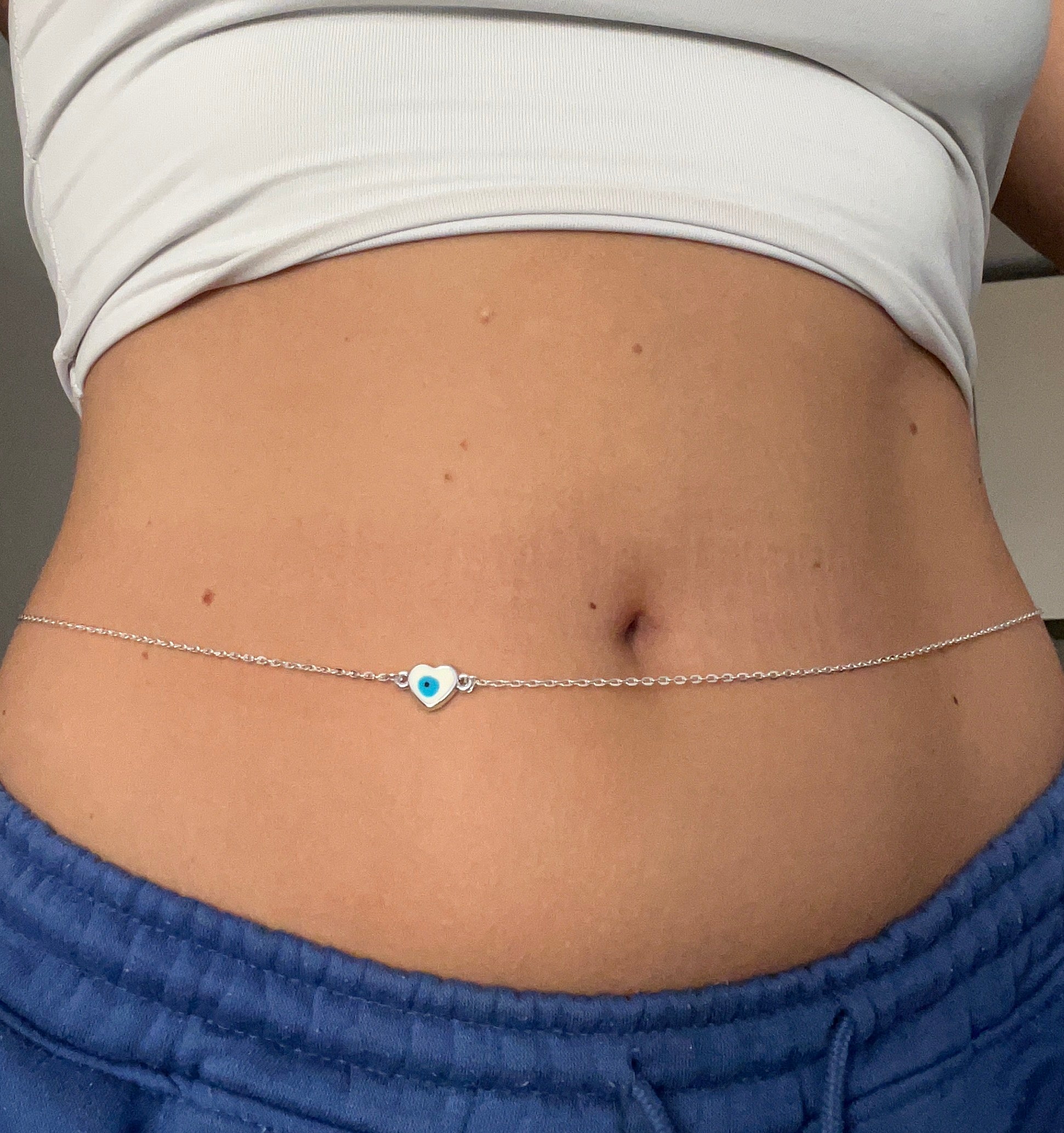 Beautiful handmade belly chain in silver with cute evil eye heart pendant detail.