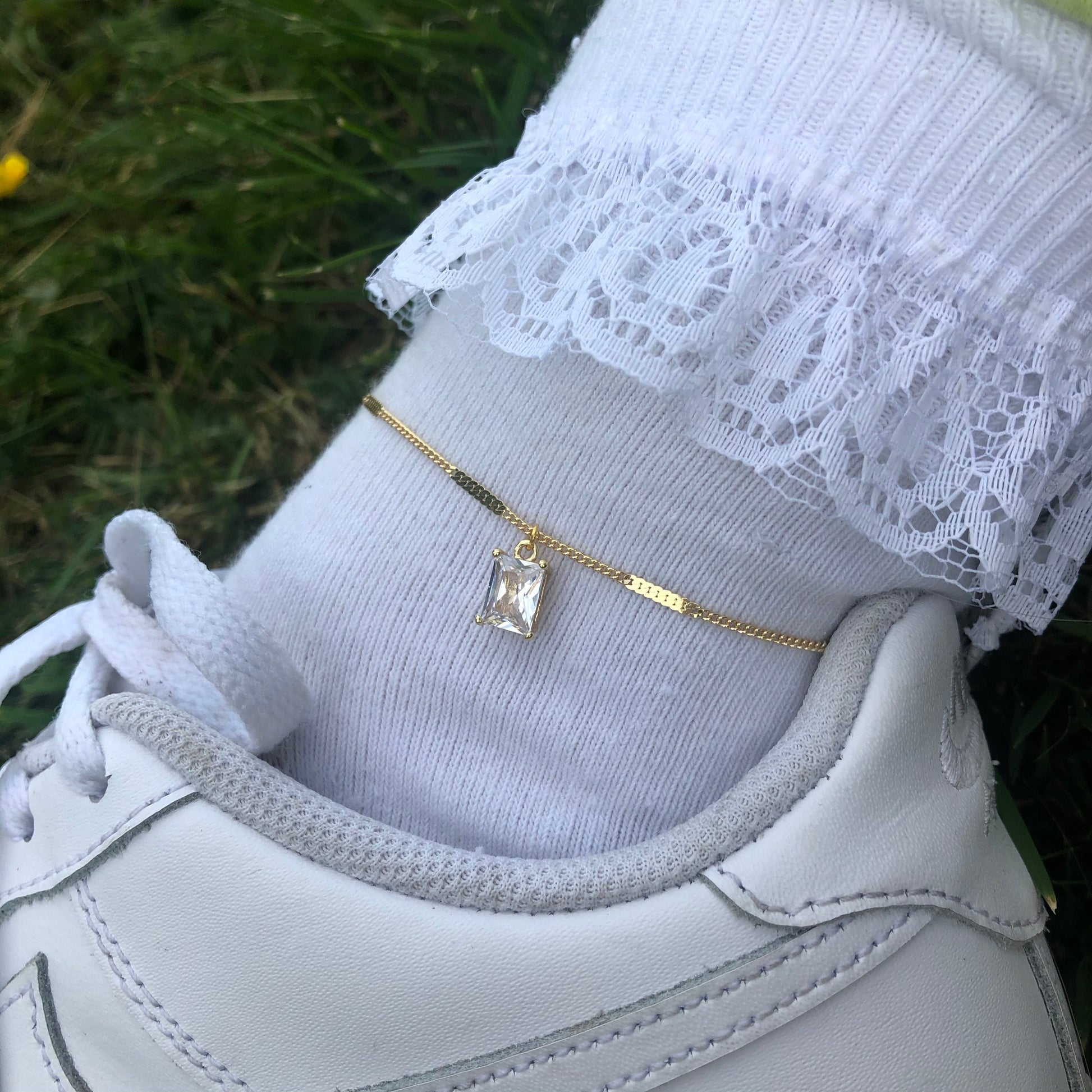 Beautiful handmade pressed link chain anklet with a CZ paved crystal charm
