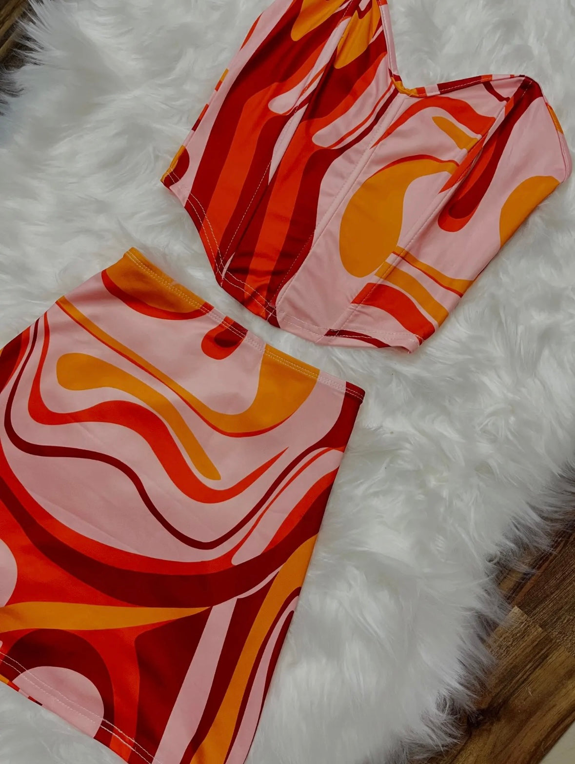 Introducing the Fusion co ord set - the perfect addition to your summer wardrobe. This vibrant set features a bold orange and red print, perfect for making a statement. Elevate your style with this must-have co ord set.