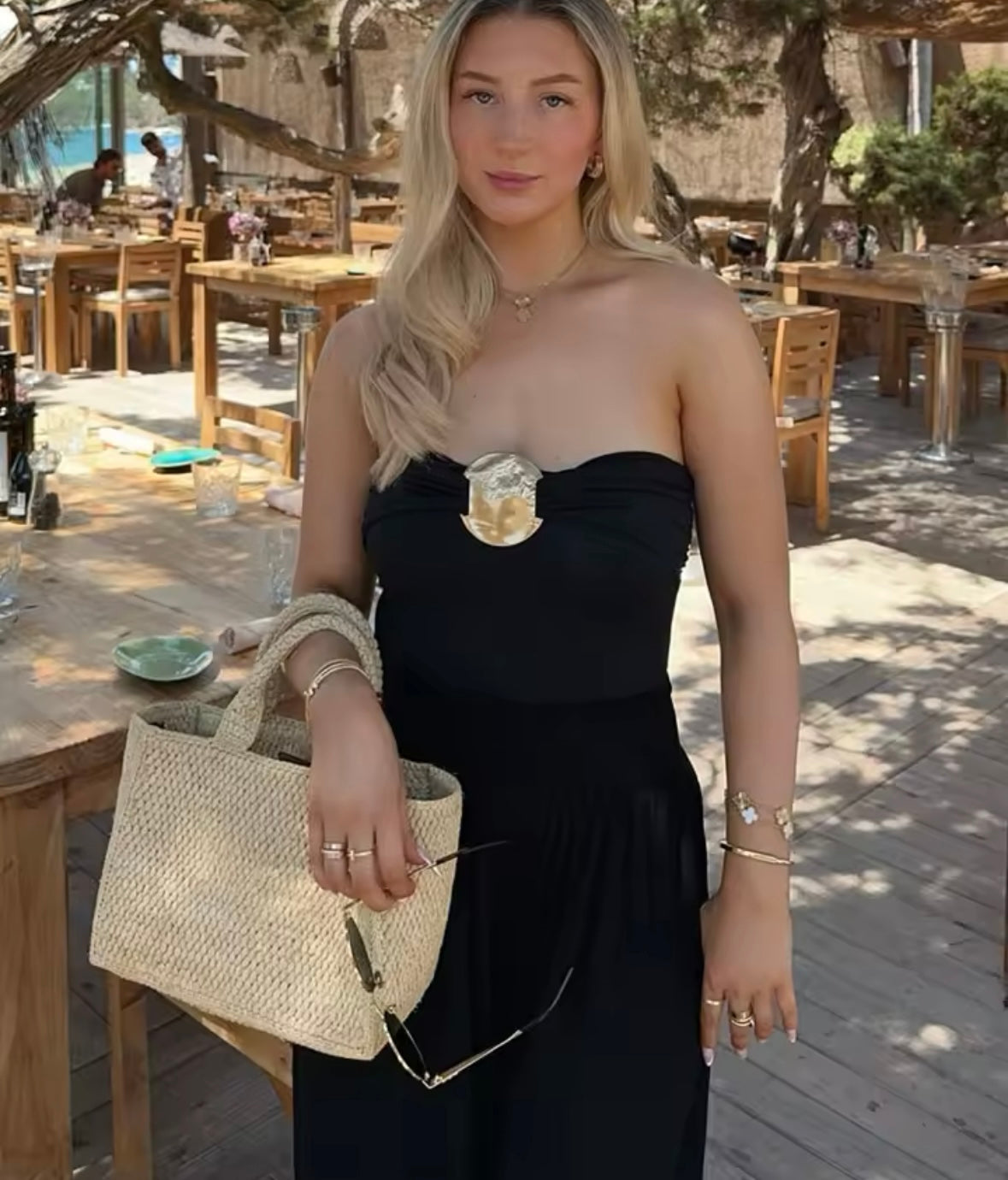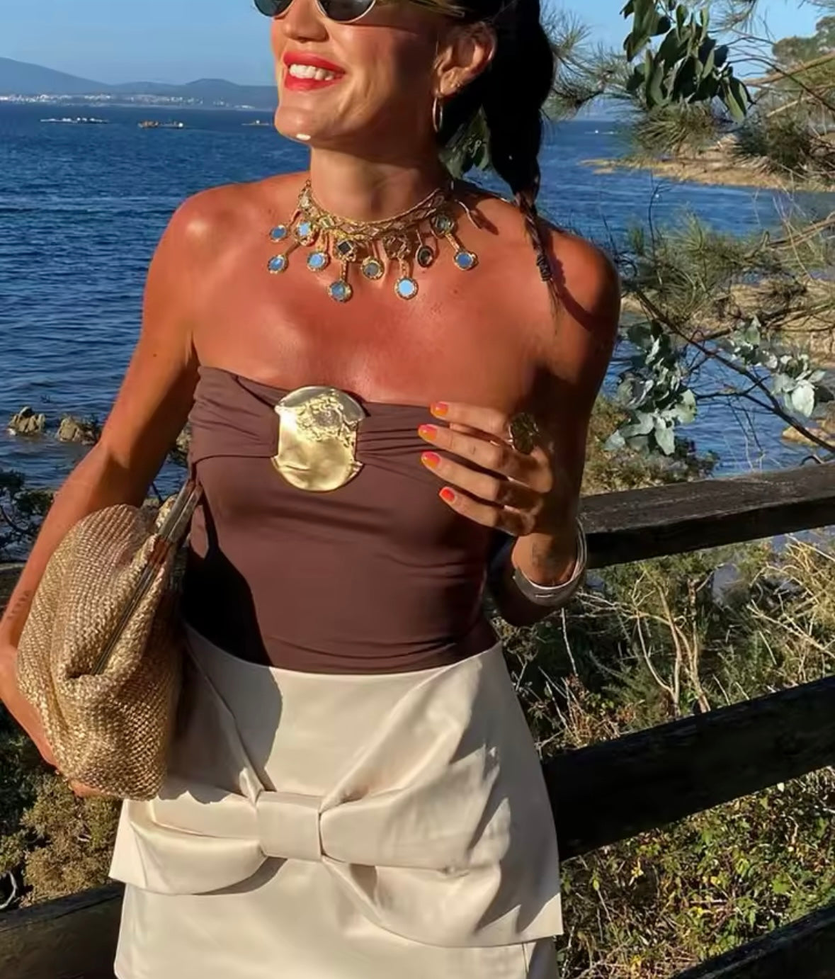 Introducing the Gold Detail Bodysuit, featuring elegant gold accents that add a touch of luxury to any outfit. Made with high-quality fabric, this bodysuit hugs your curves for a flattering fit. Elevate your wardrobe with this must-have piece.
