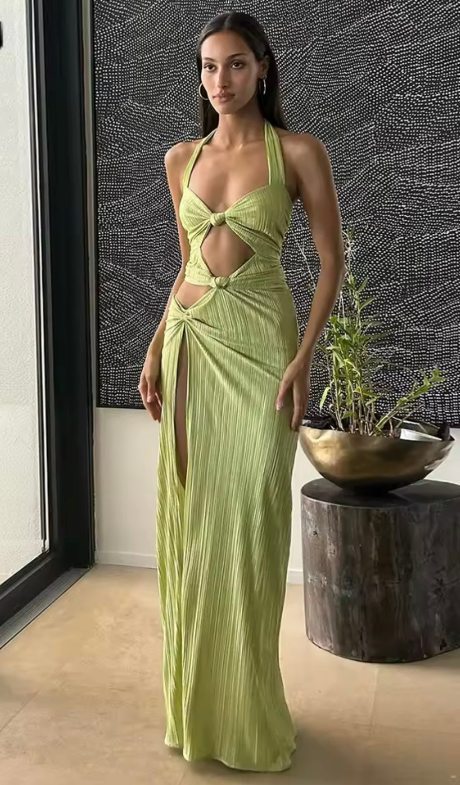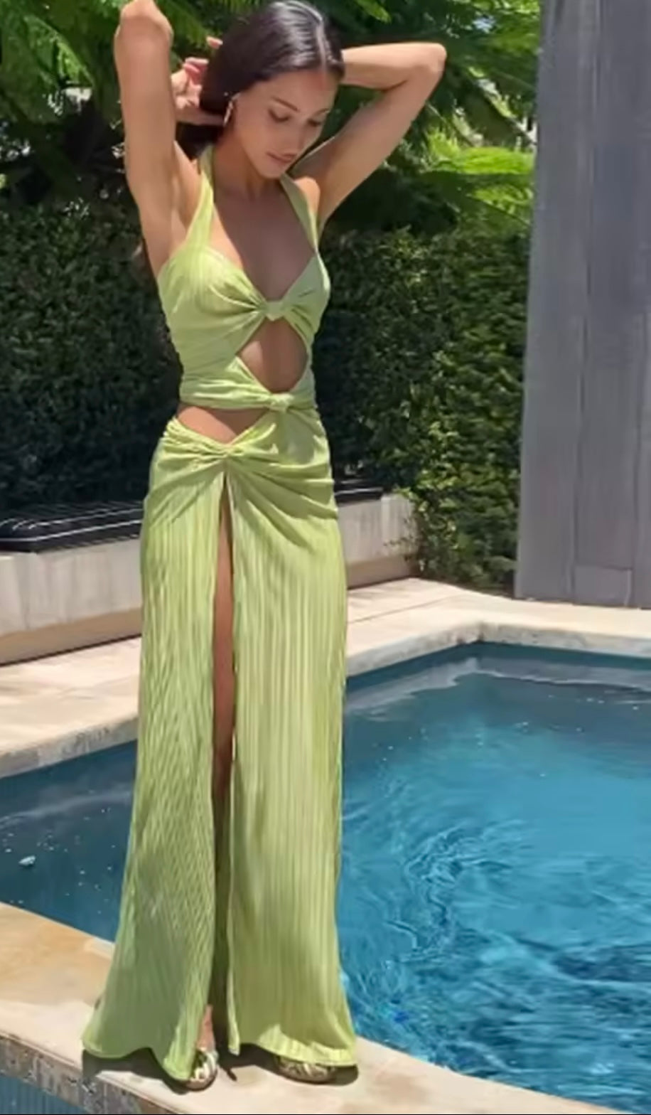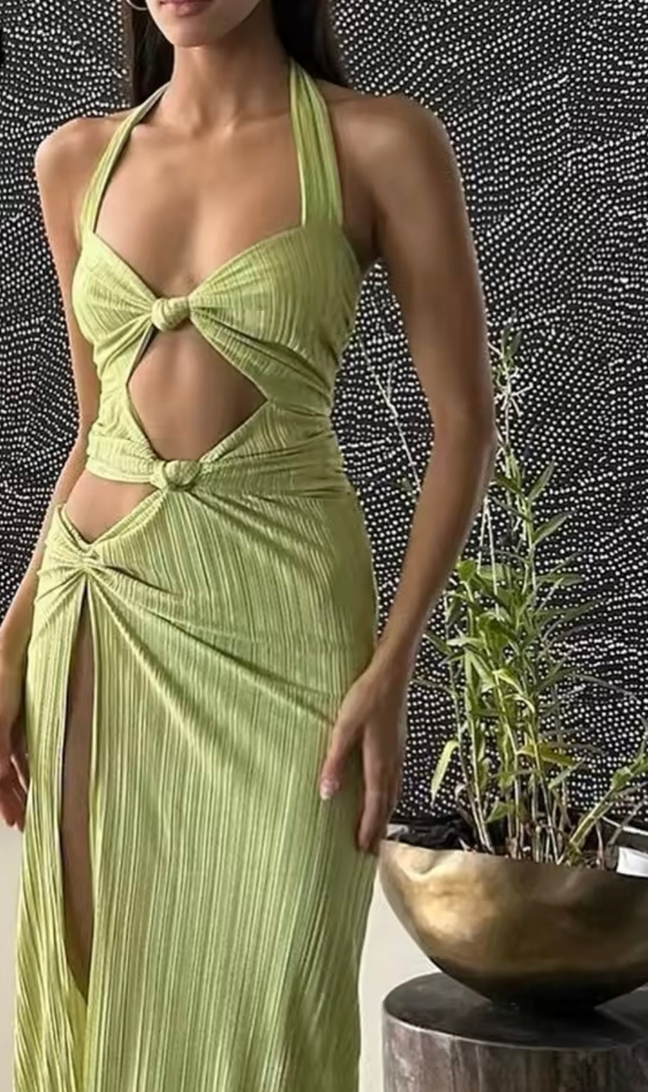 Enhance your summer wardrobe with our Green Cut Out Maxi Dress. The bold green color and sexy cut outs make this dress a must-have for any occasion. This dress is sure to make a statement and turn heads wherever you go.