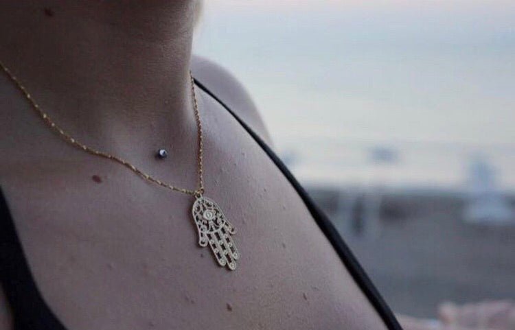 The Hand of Fatima is an ancient talisman that symbolises feminine power. The hand is worn as a defence against negative energy as it deflects the gaze of the evil eye away from the wearer.