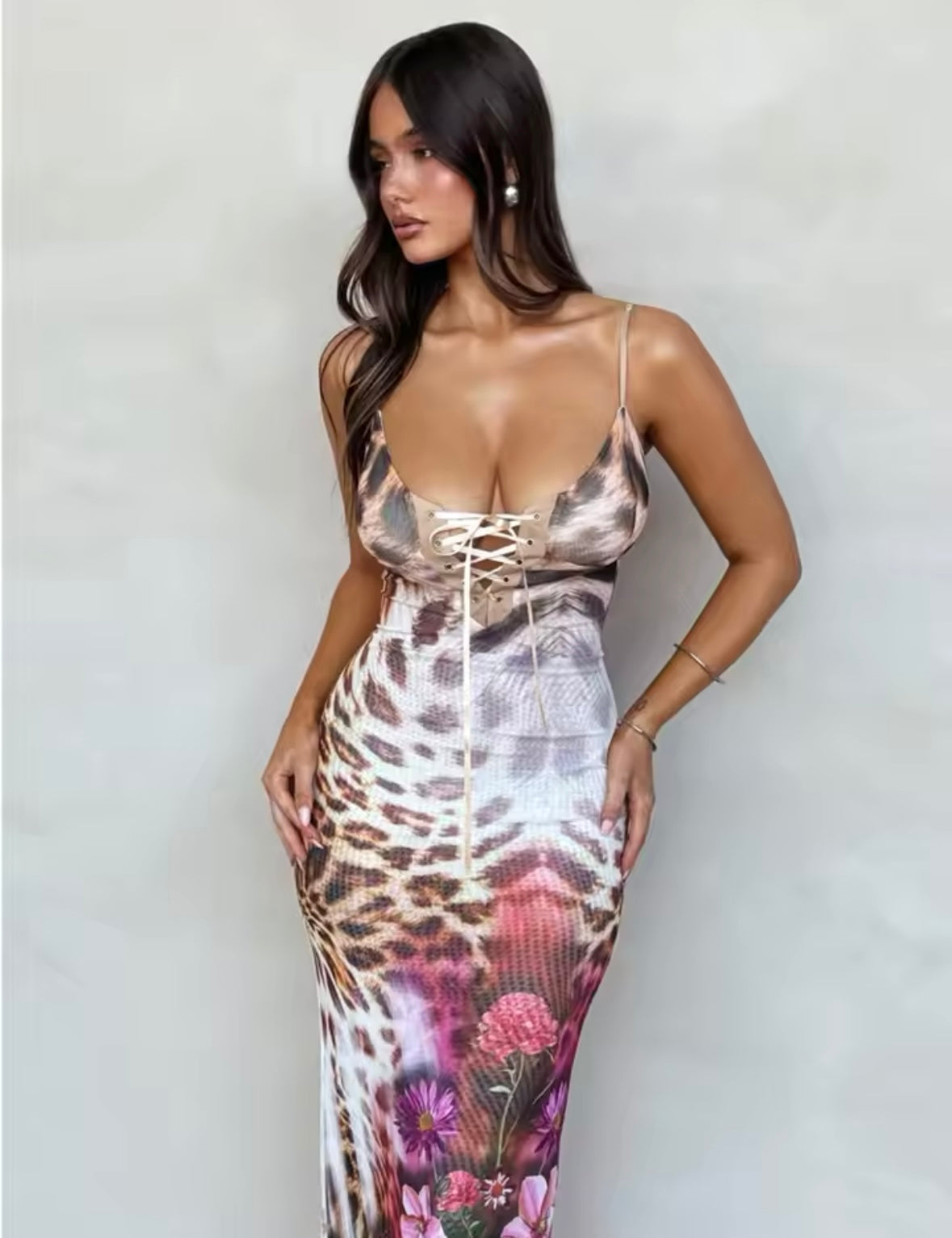 This elegant maxi dress features a striking leopard roses print, adding a touch of wild sophistication to any occasion. With its flowy silhouette and soft fabric, it offers both comfort and style. Perfect for date nights, weddings, or any event that calls for a statement look.