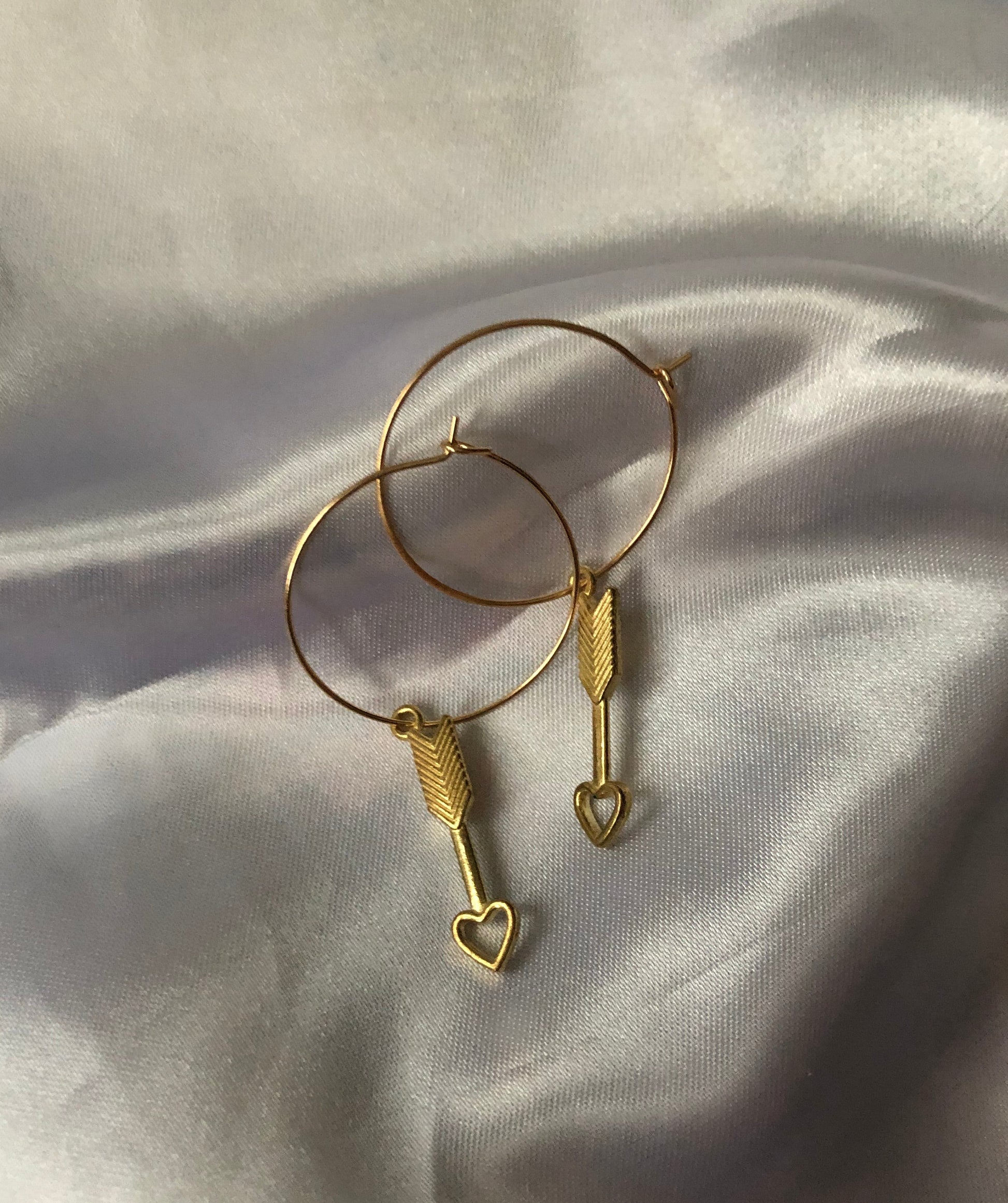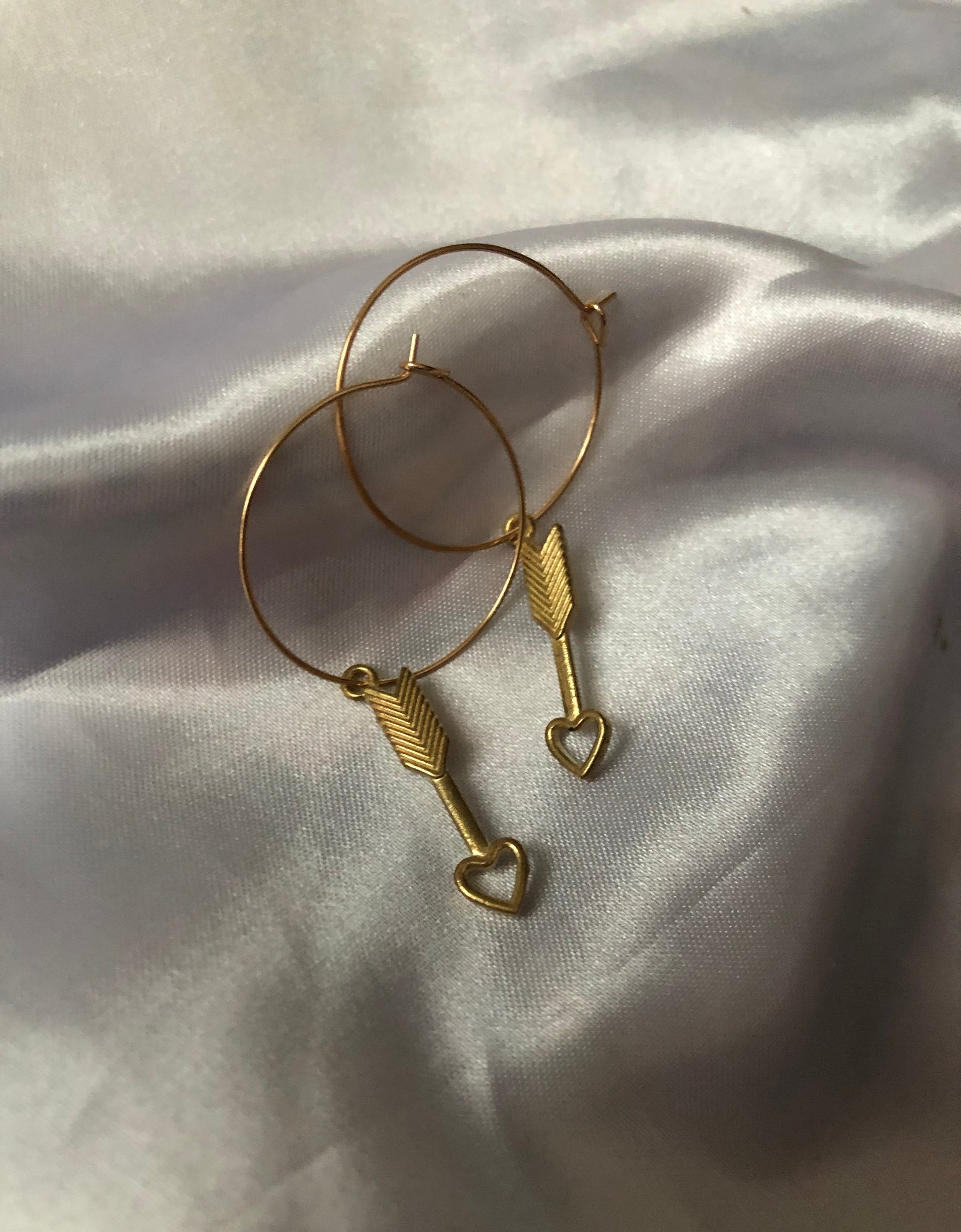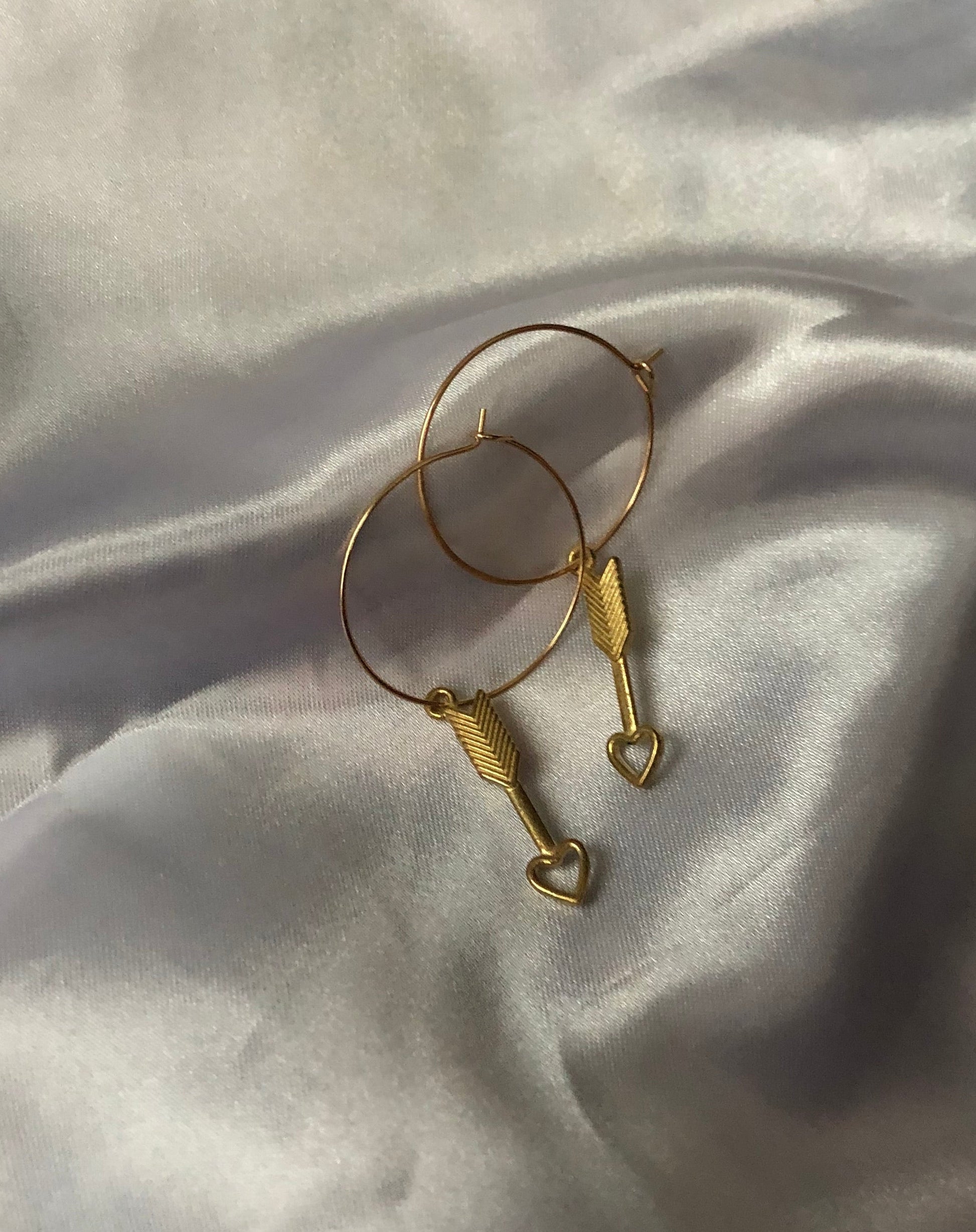 Beautiful earrings with a love arrow pendant detail in gold.