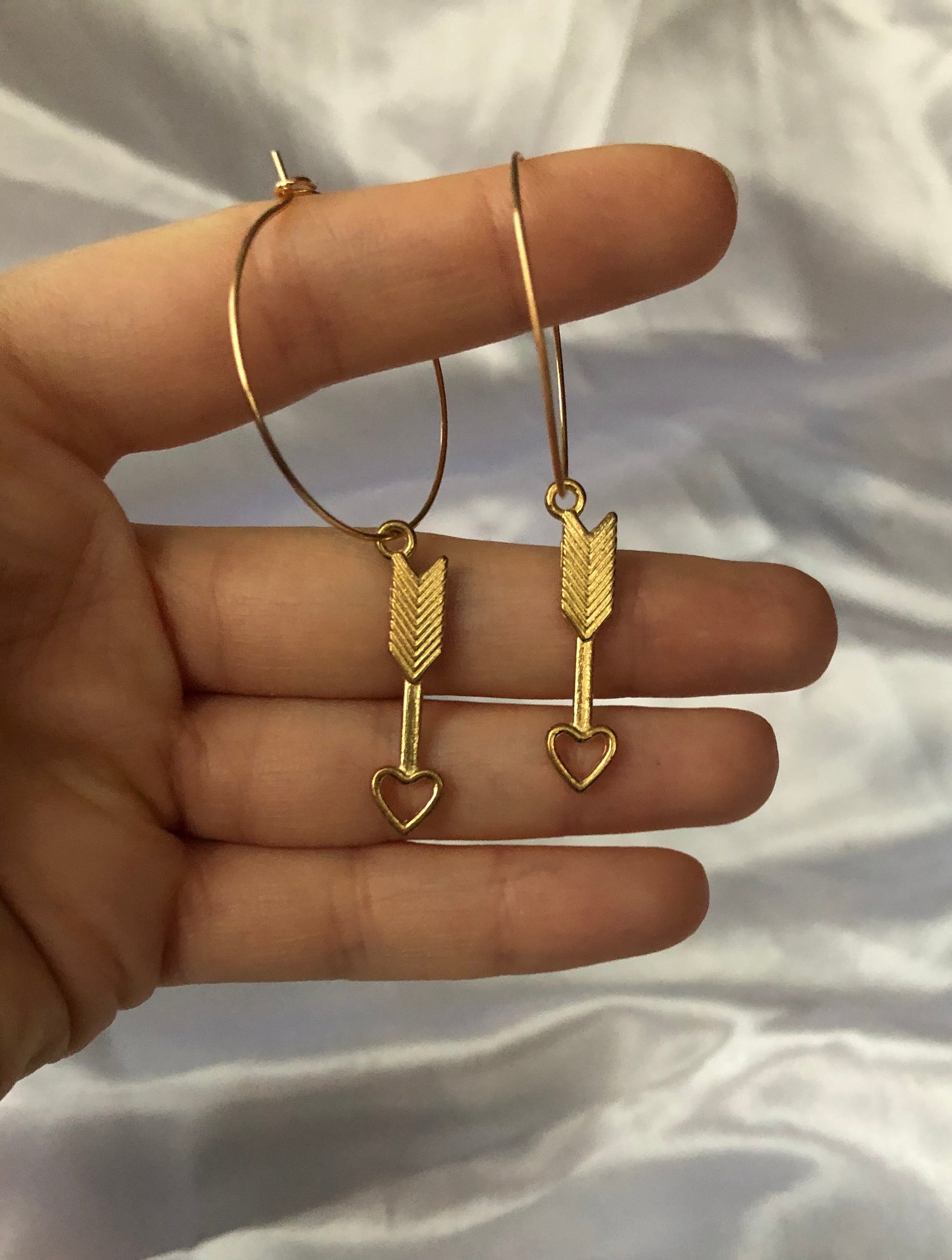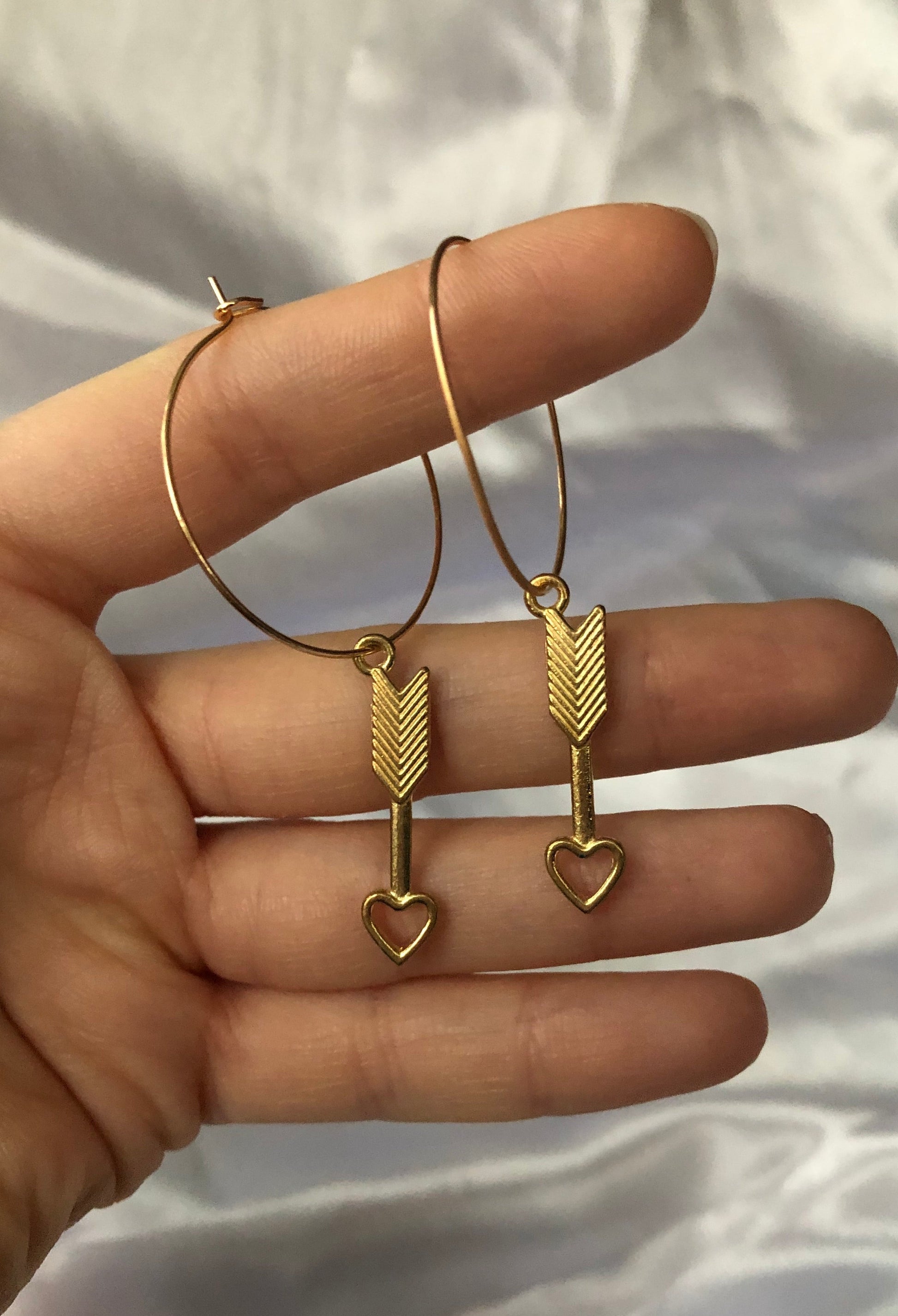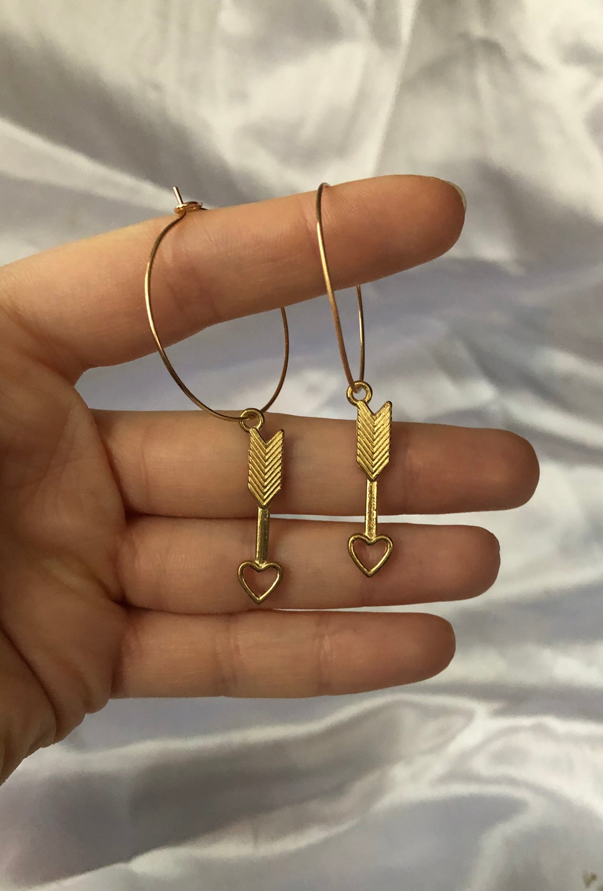 Beautiful earrings with a love arrow pendant detail in gold.