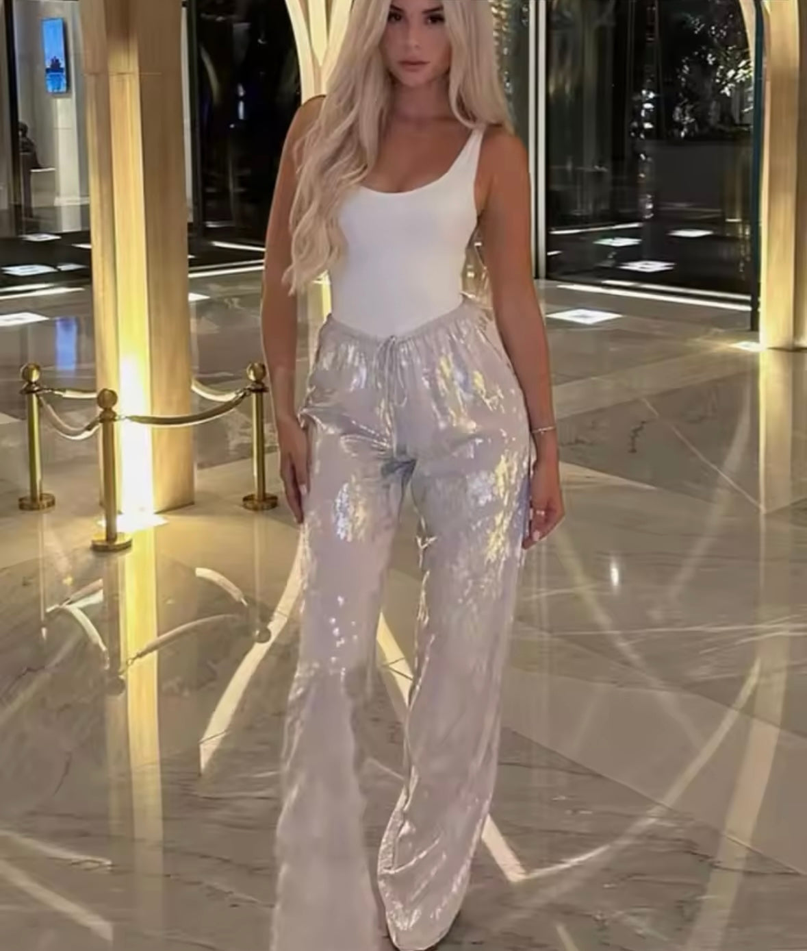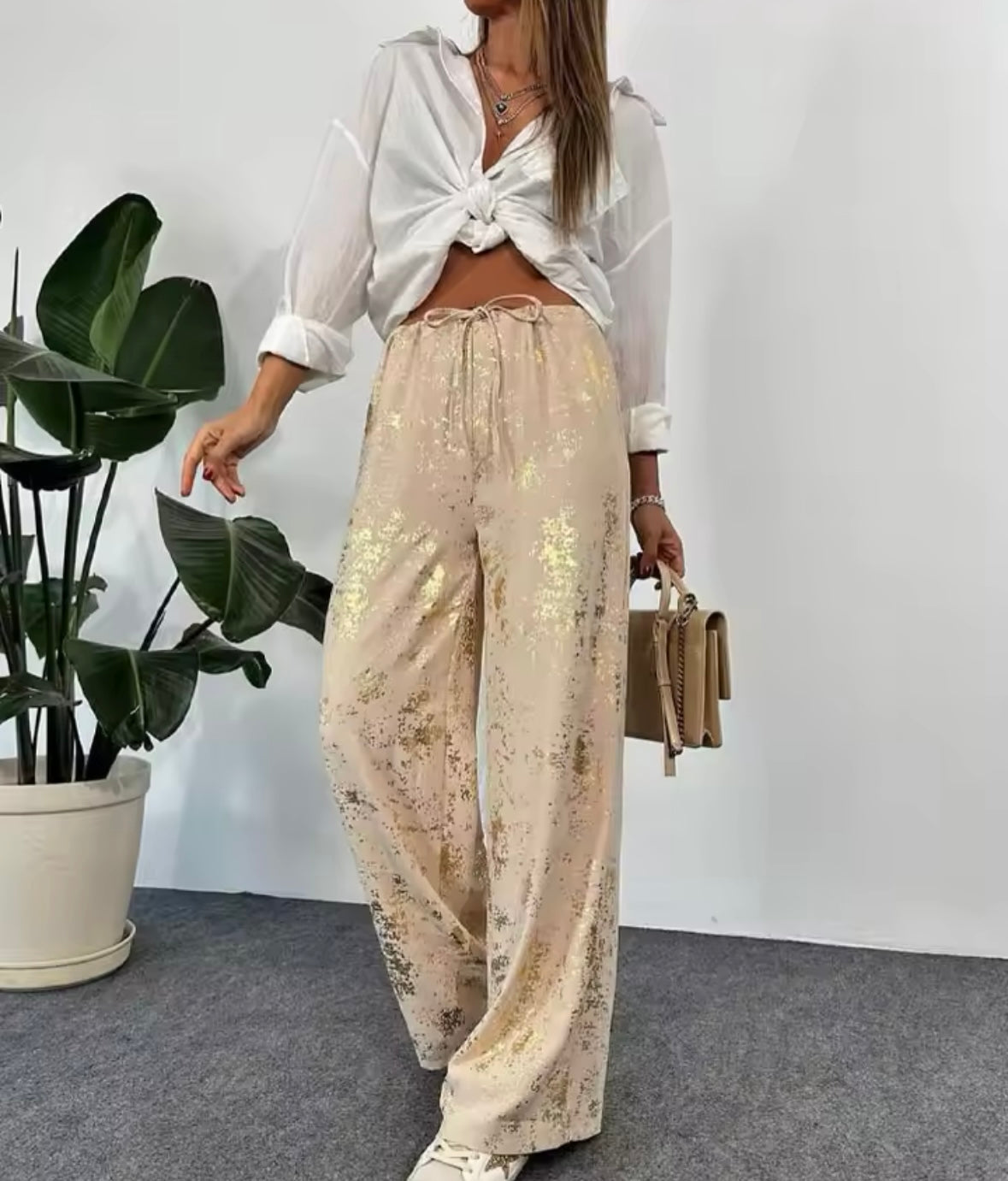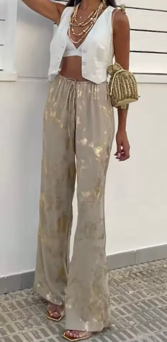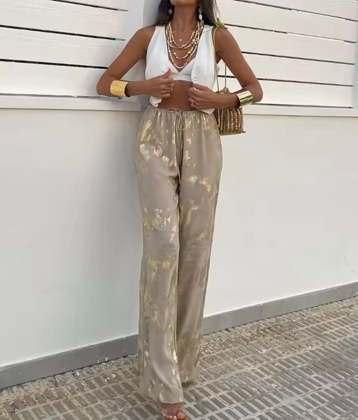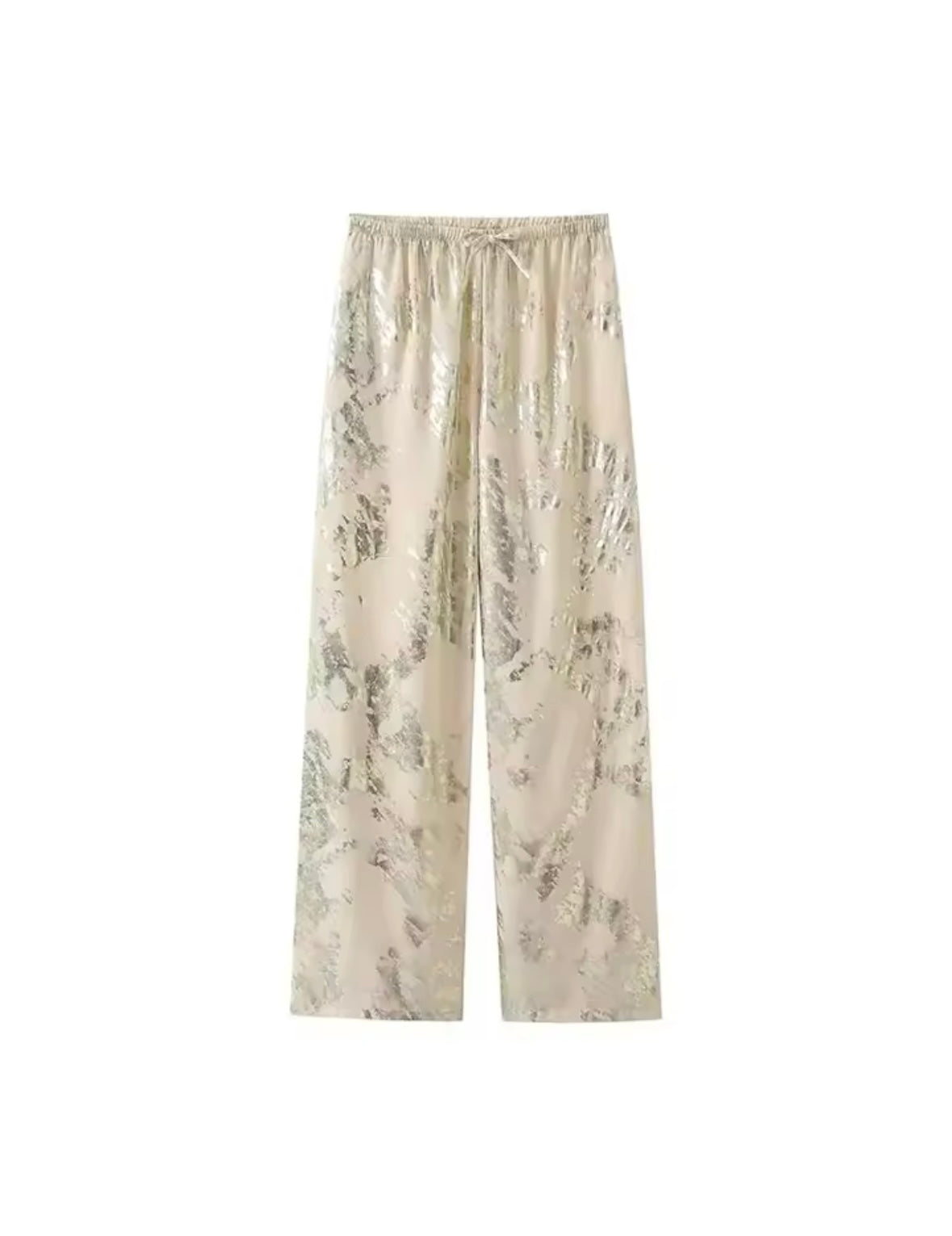 Expertly designed for a modern twist on a classic wide leg style, our Metallic Wide Leg Trousers feature a stunning metallic print that adds a touch of glamour to any outfit. With a comfortable fit and eye-catching design, these trousers are perfect for making a statement at any event.