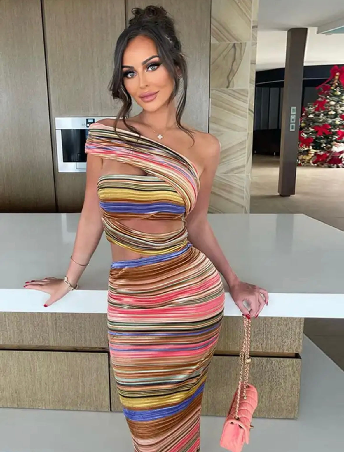This expertly designed multi-colour cut out maxi dress is the perfect summer addition to your wardrobe. Featuring a vibrant colour palette and stylish cut outs, this dress will keep you cool and fashionable all season long. With its versatile design, it can be dressed up or down for any occasion.