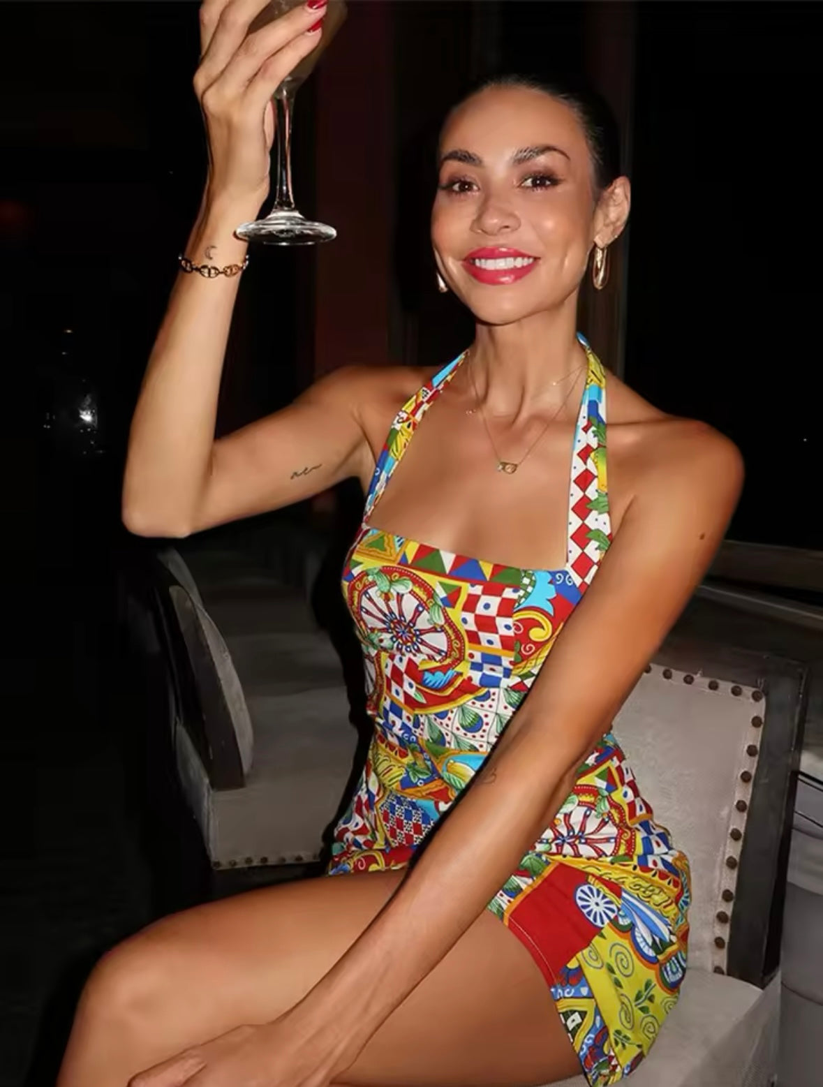 This multi-color mini dress is the perfect addition to your summer wardrobe. Made with light and breathable fabric, it will keep you cool and comfortable during warm days. Its colorful design adds a lively touch to any outfit, making it a versatile and stylish choice.