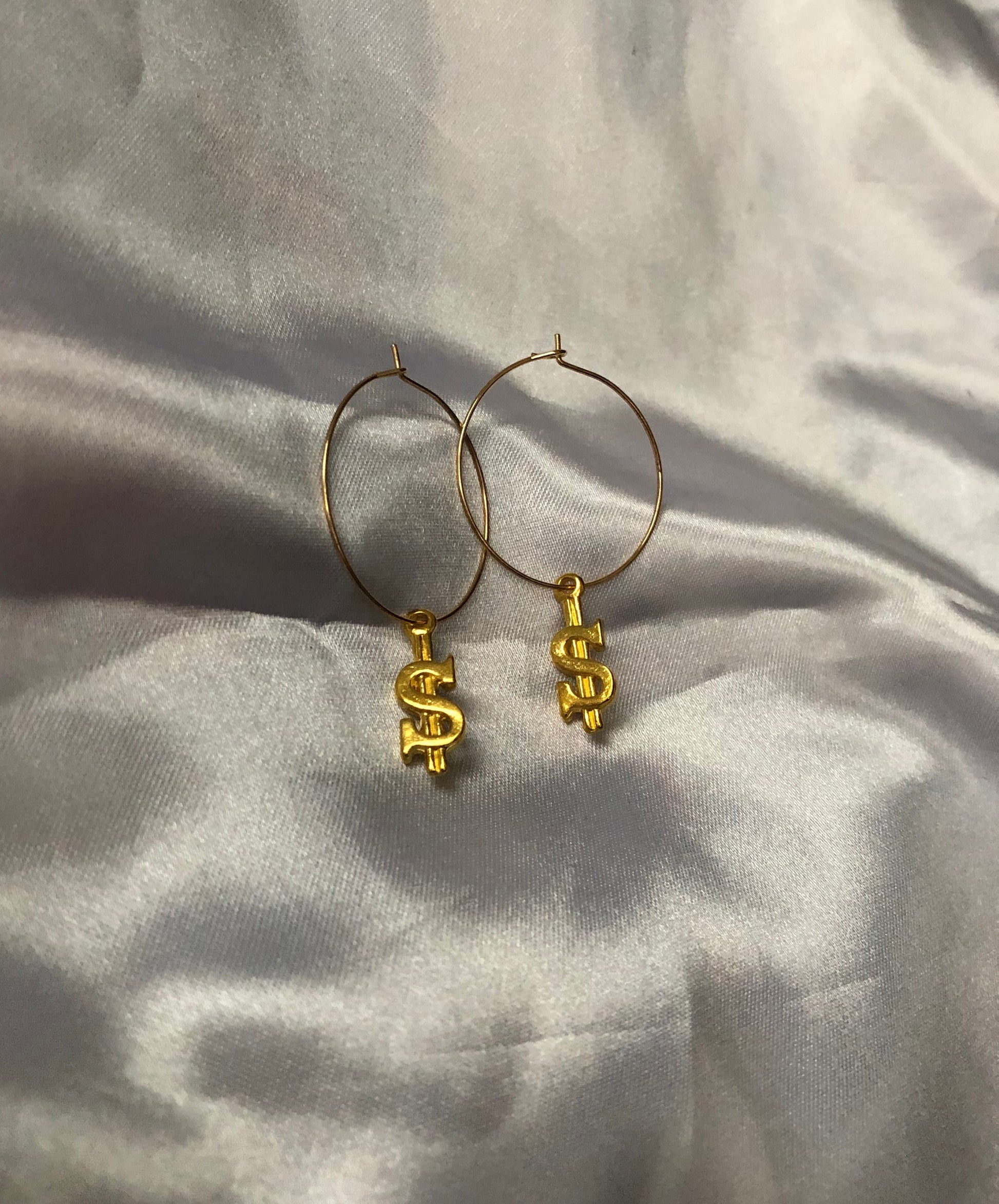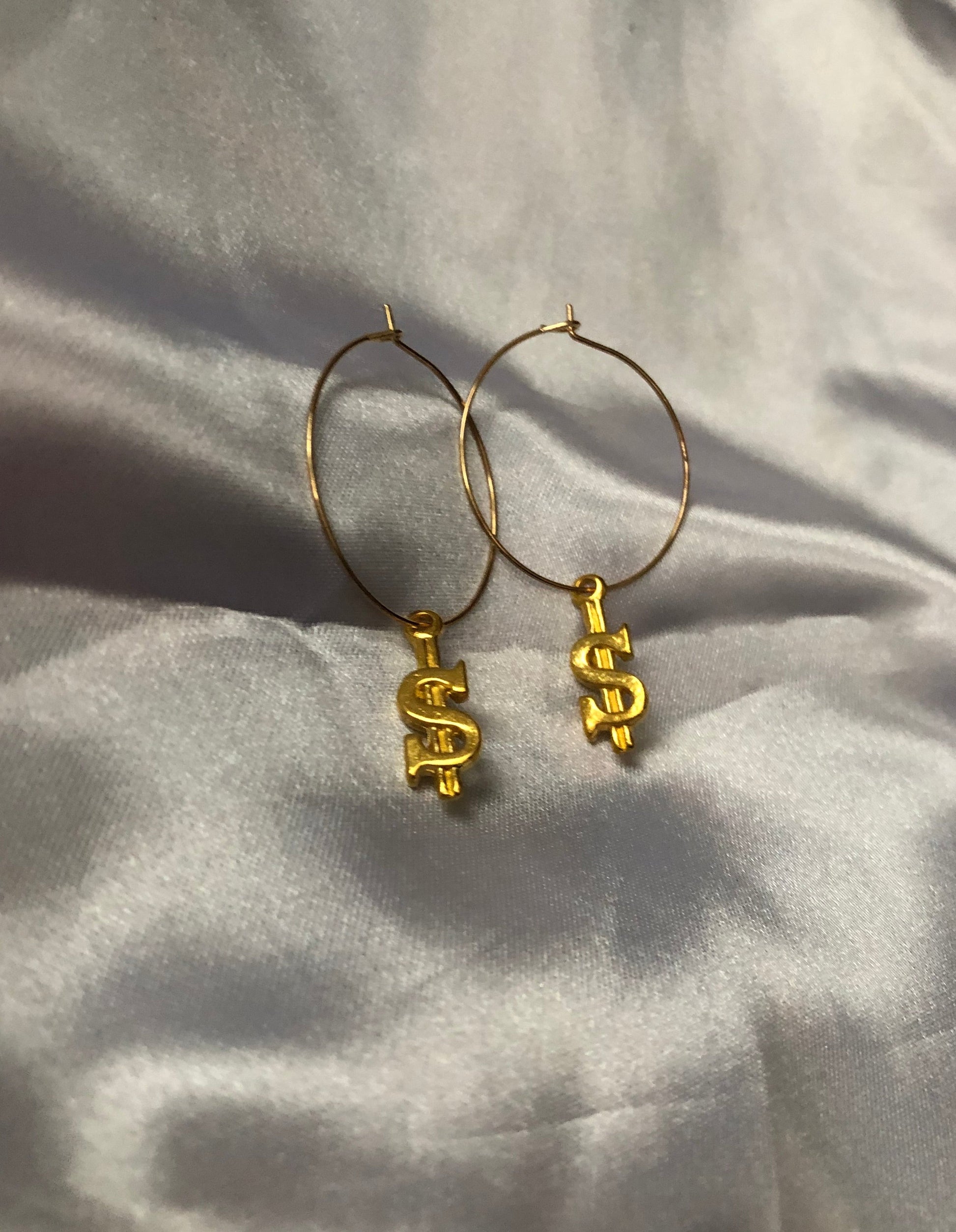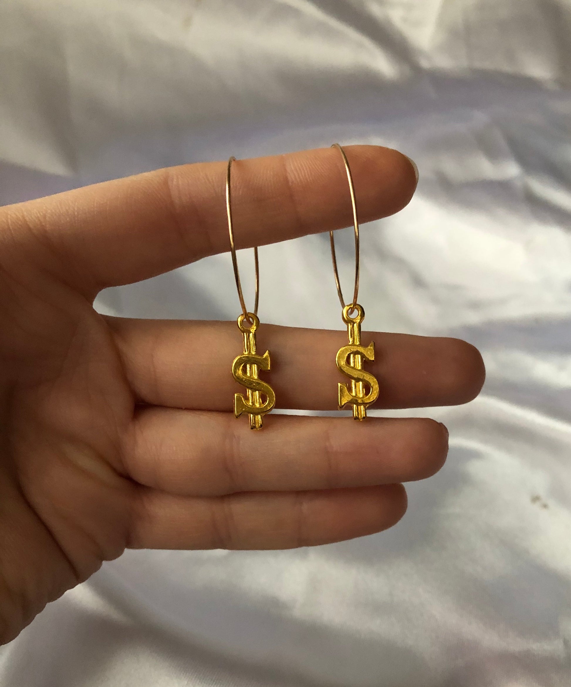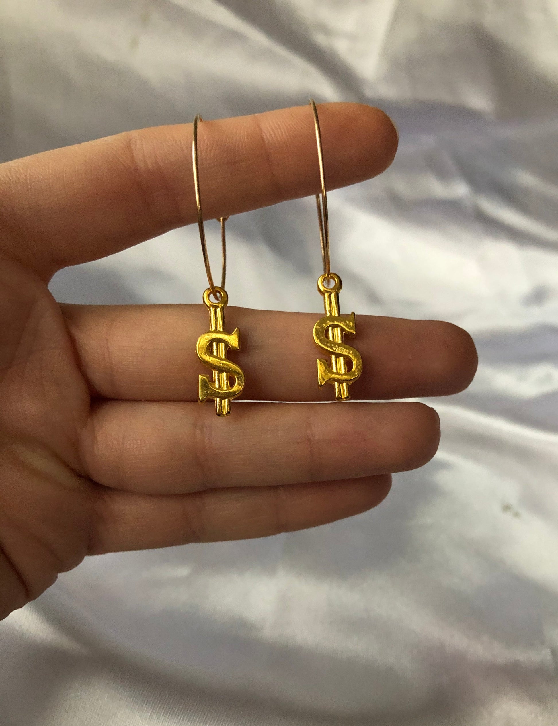 Beautiful earrings with a dollar sign pendant detail in gold.