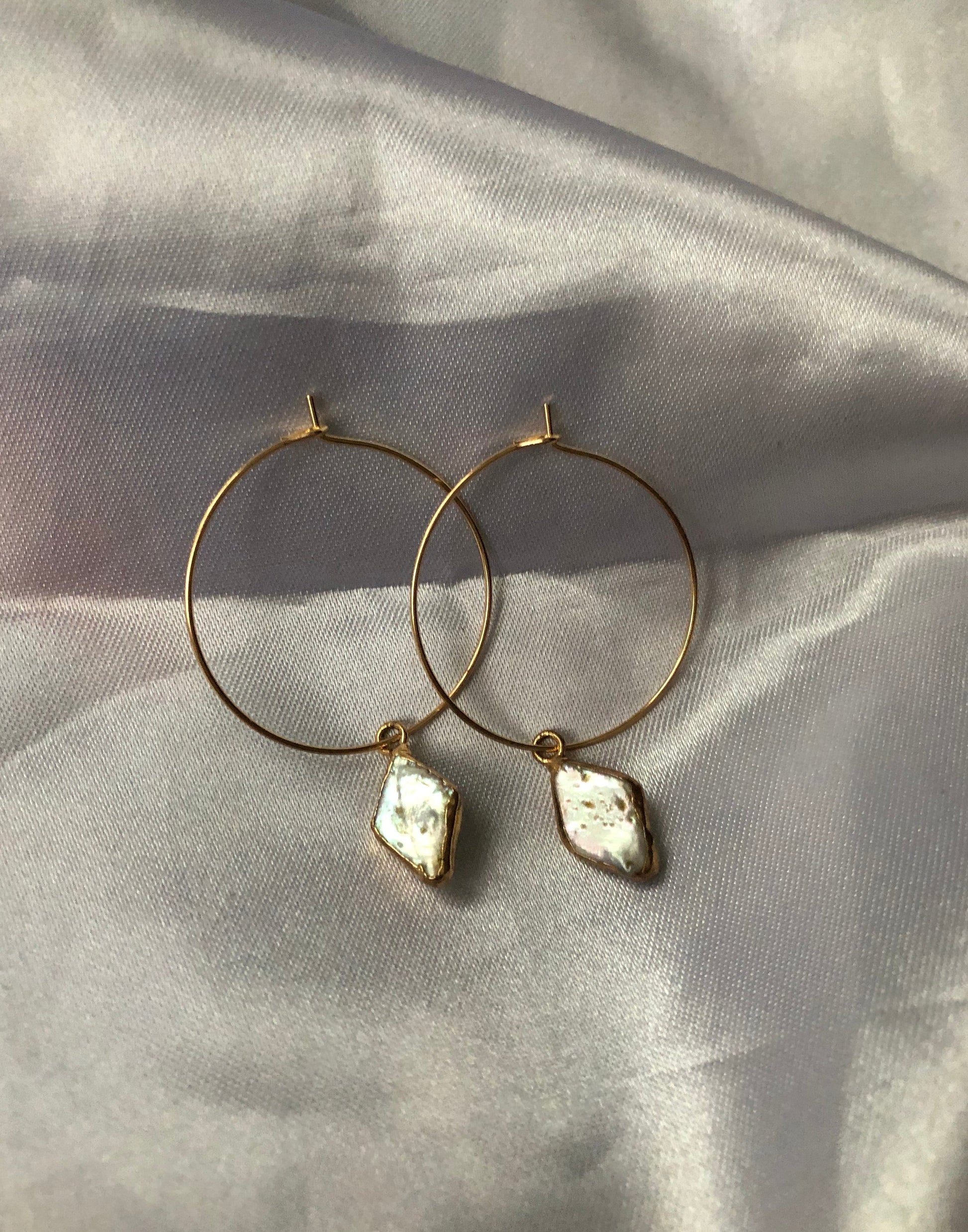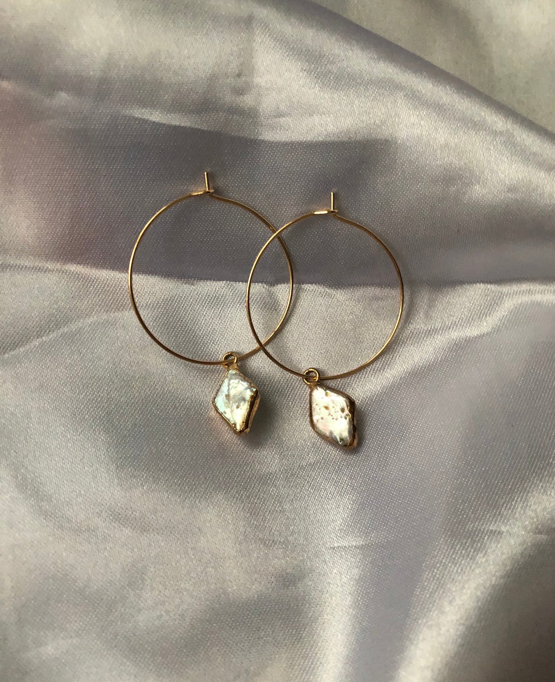 Cute handmade hoops with a pearly pendant detail in gold.