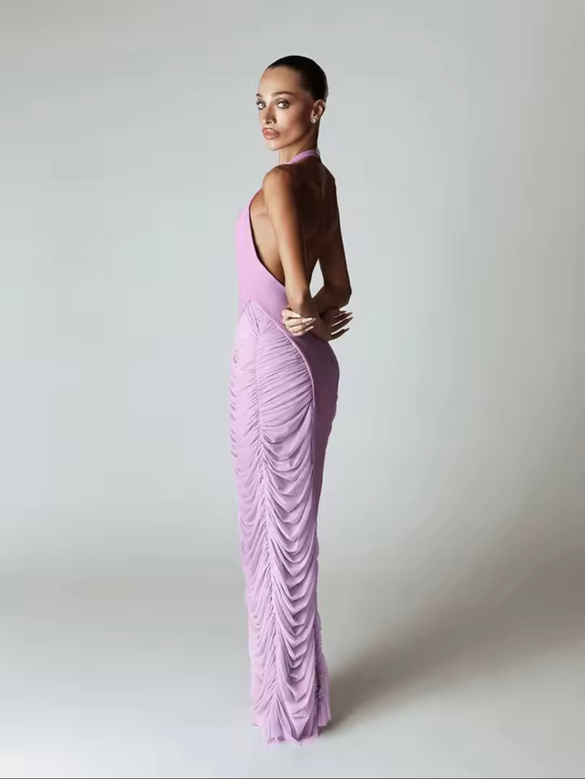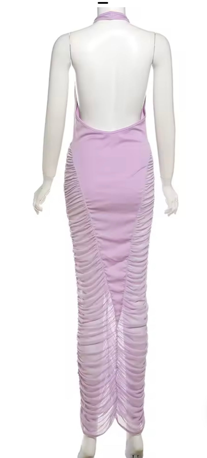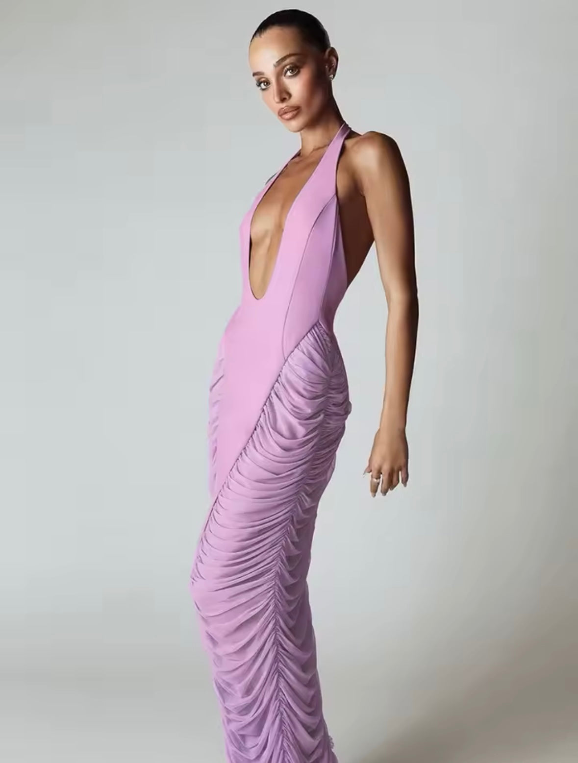 This purple plunge neck maxi dress features a mesh fabric on the sides, adding a touch of elegance and breathability. Perfect for special occasions, it offers a flattering silhouette and comfortable fit. Elevate your style with this stunning dress.