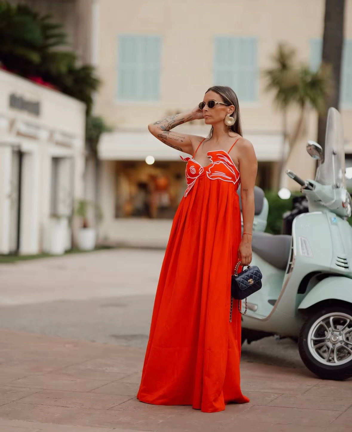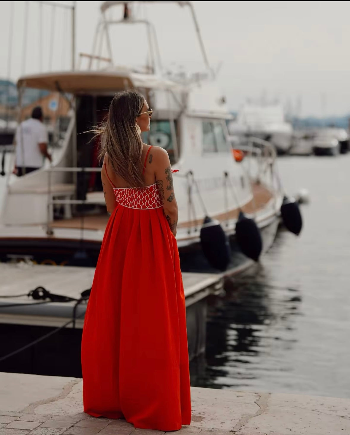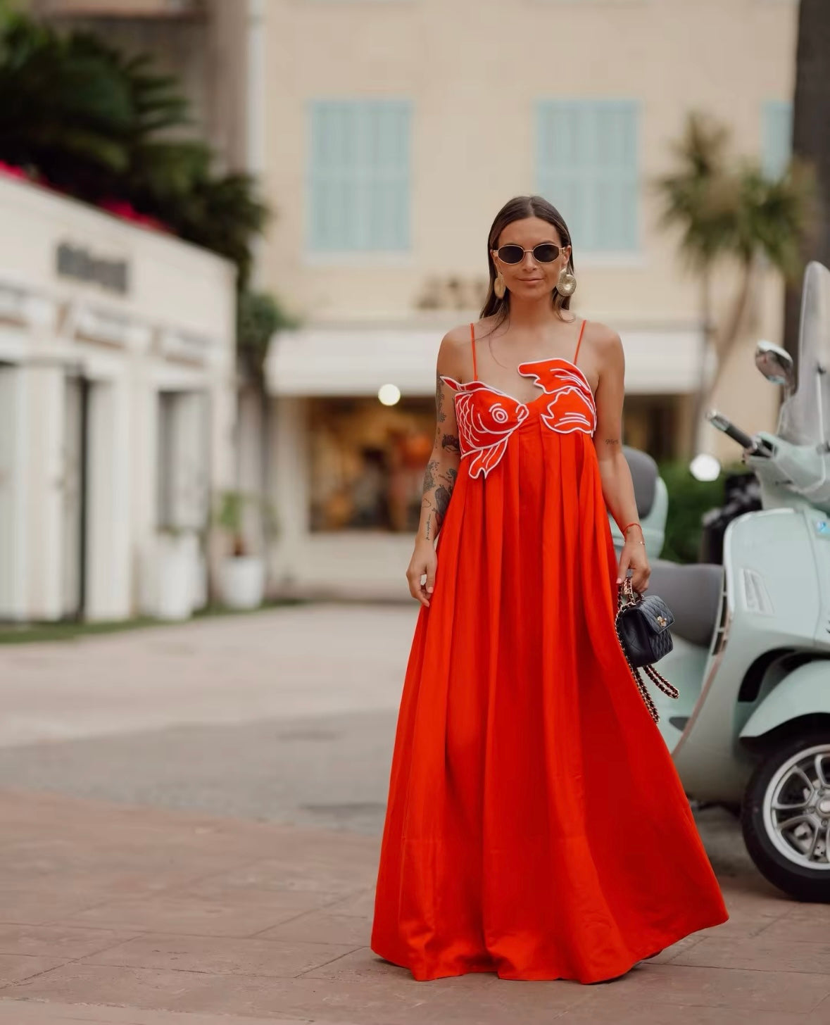 This maxi dress features a bold red color with a unique fish-like design, sure to make a statement. Its flowing silhouette exudes elegance while adding a touch of playfulness. Perfect for any occasion, this dress will surely turn heads.
