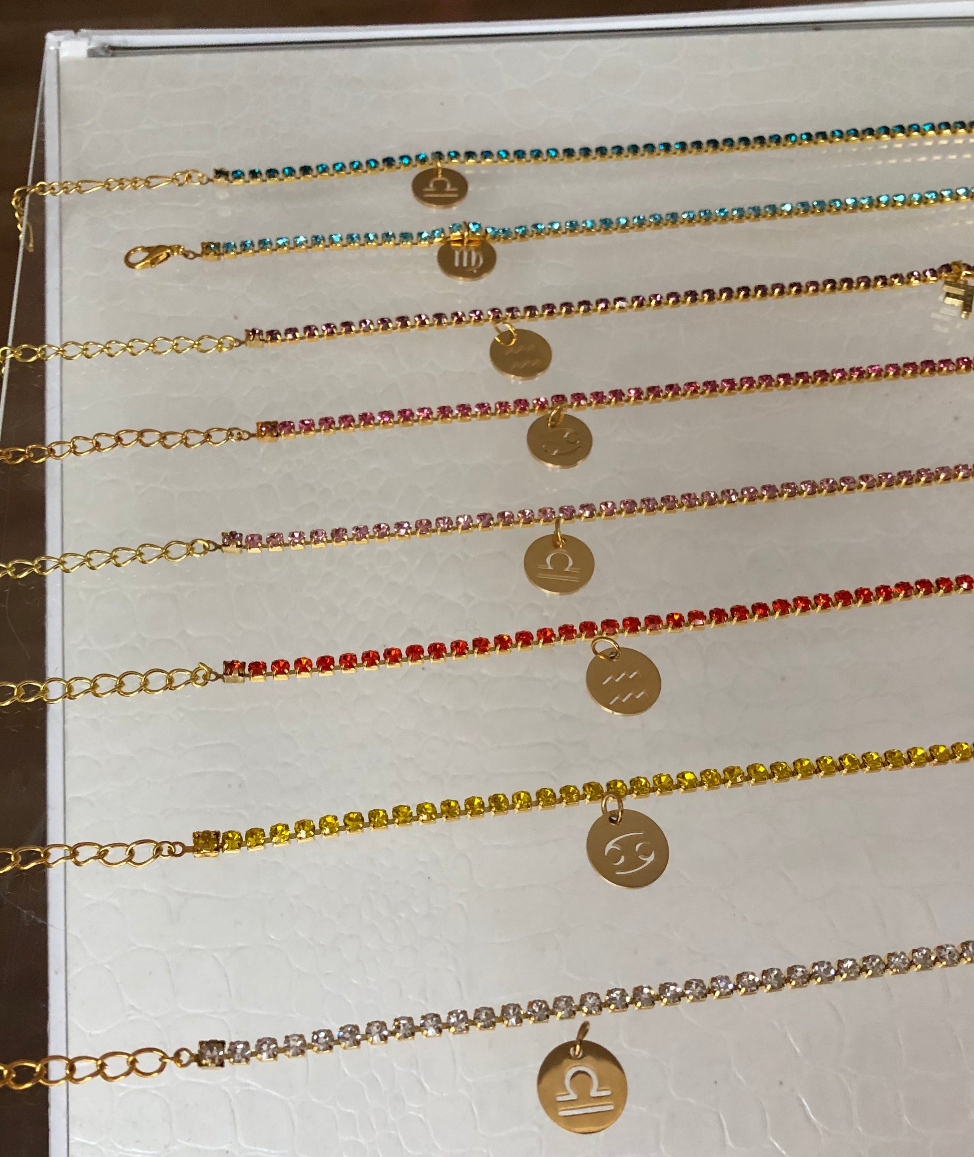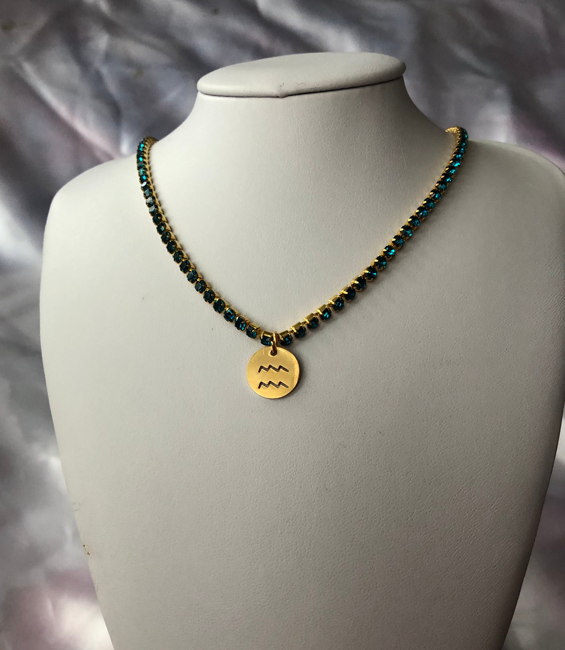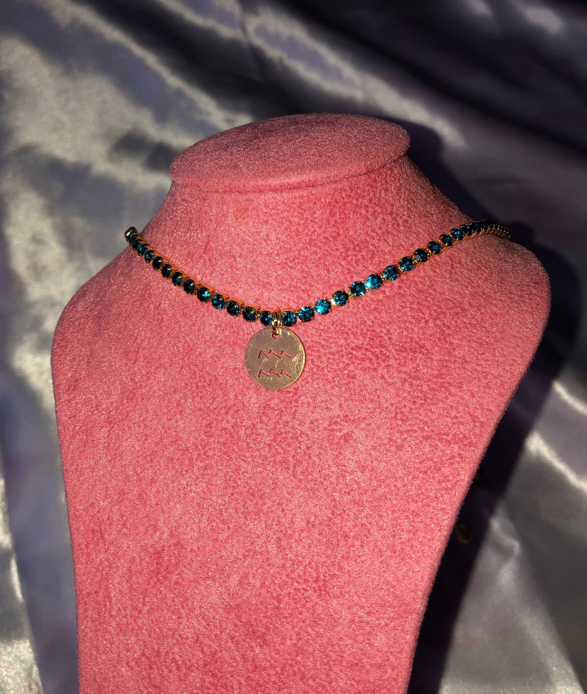 Beautiful handmade rhinestone necklace with zodiac sign pendant detail