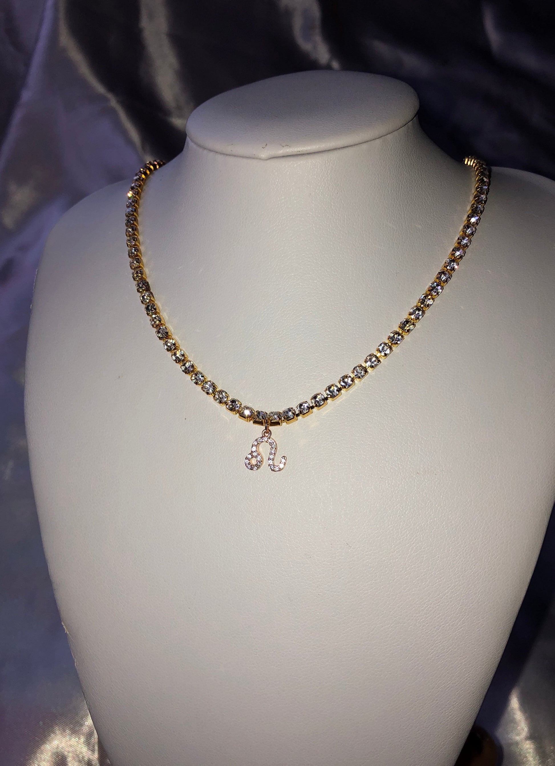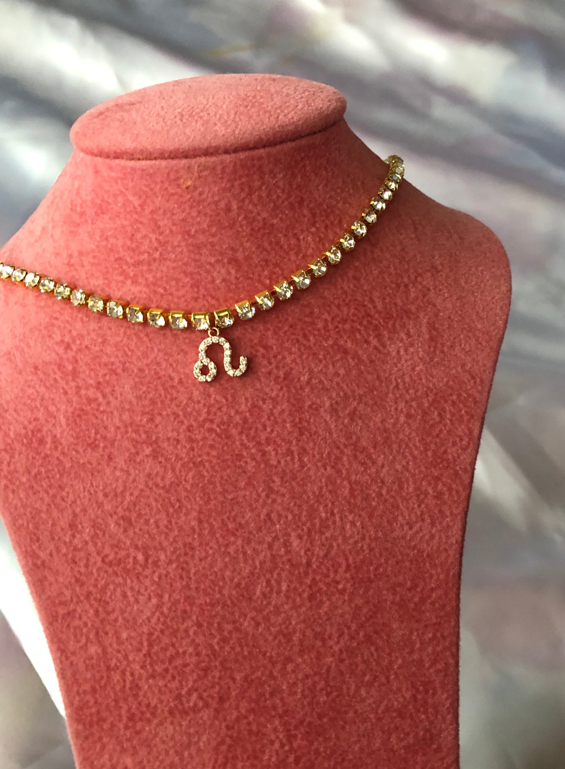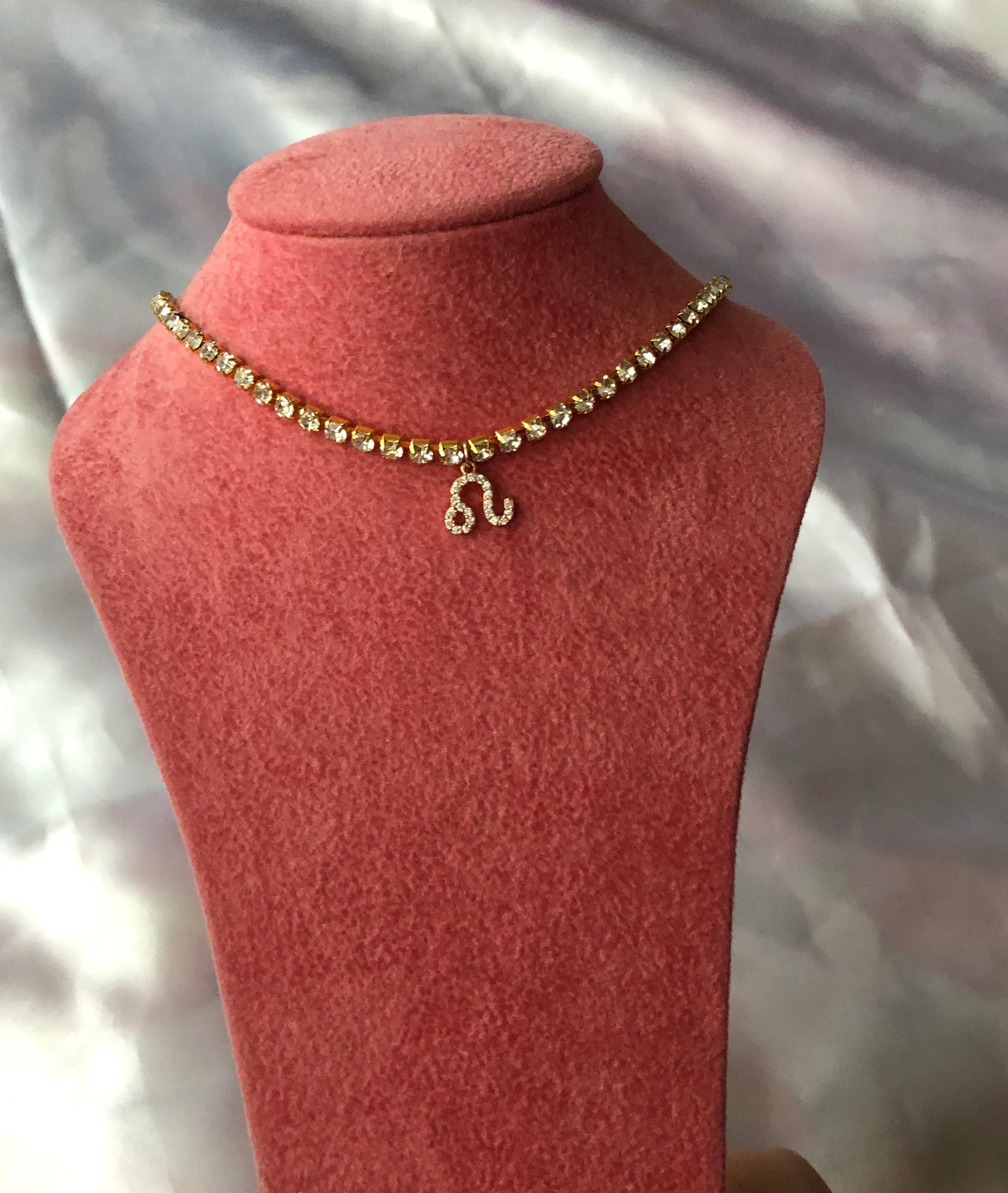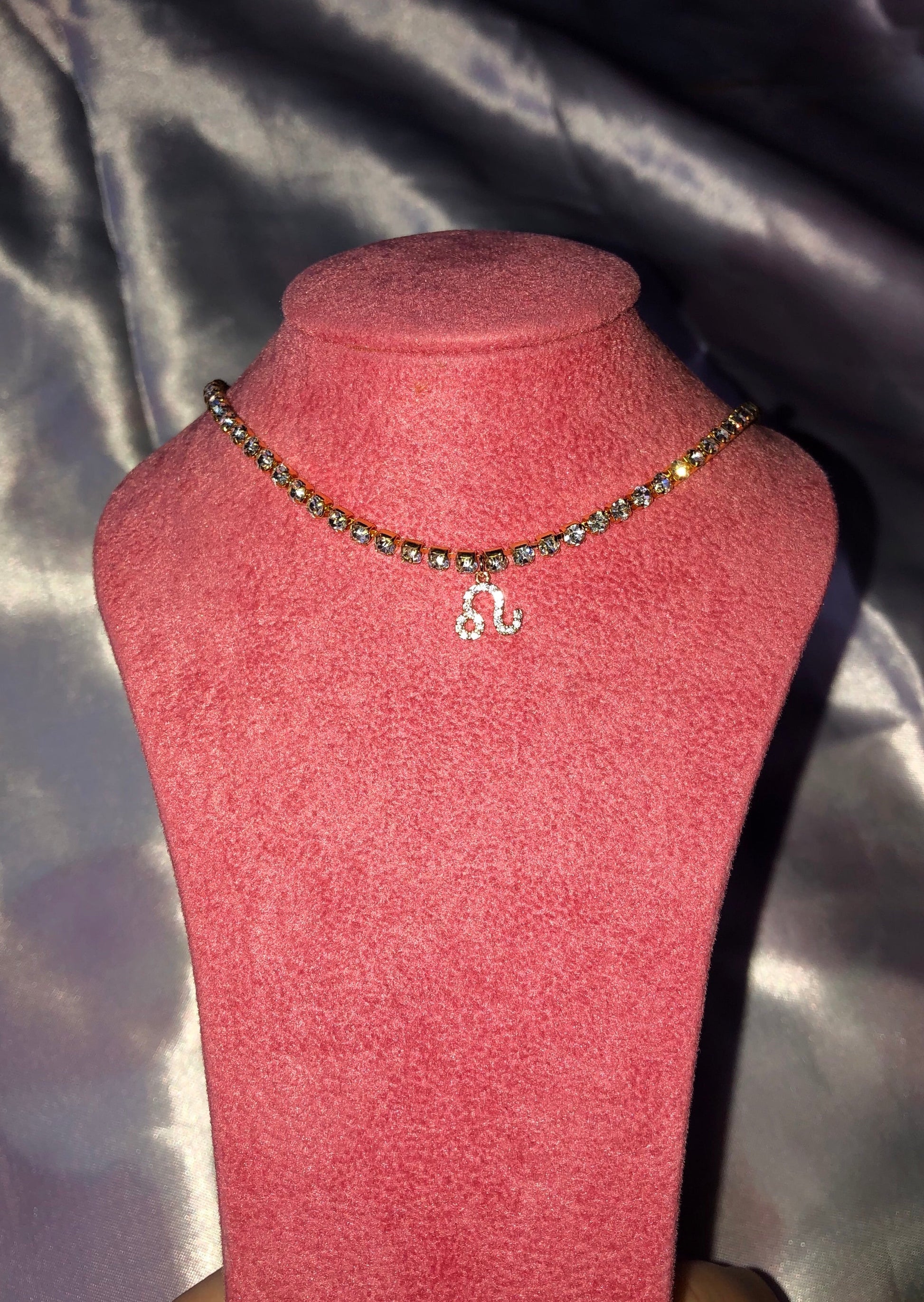 Beautiful handmade rhinestone necklace with cz zodiac sign pendant detail.
