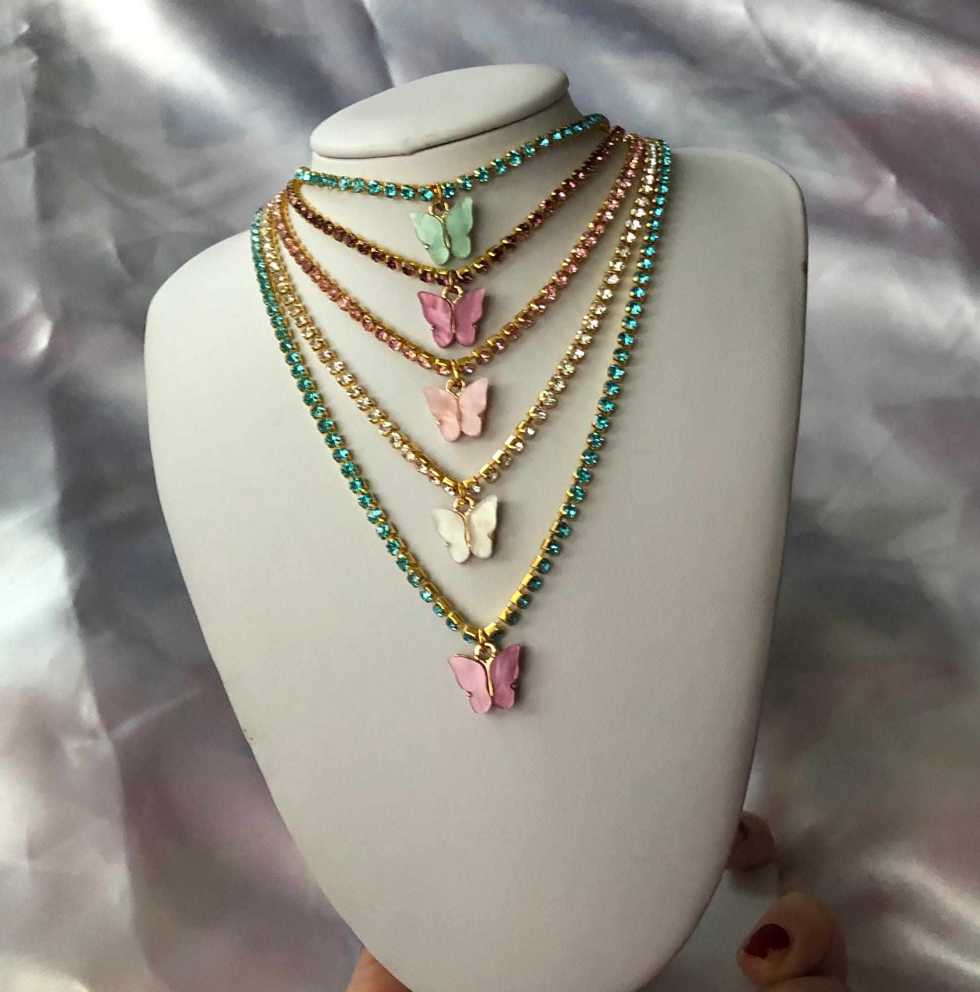 Beautiful handmade necklace made with rhinestone chain and butterfly pendant detail.
