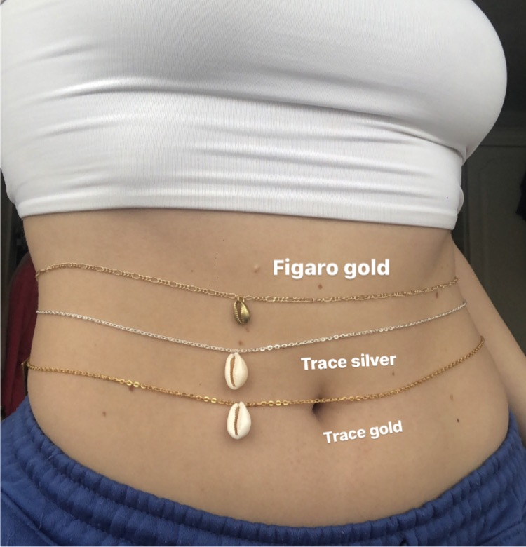 Available in 2 styles- Figaro chain/ gold seashell and Silver/Gold Trace chain/ white seashell.