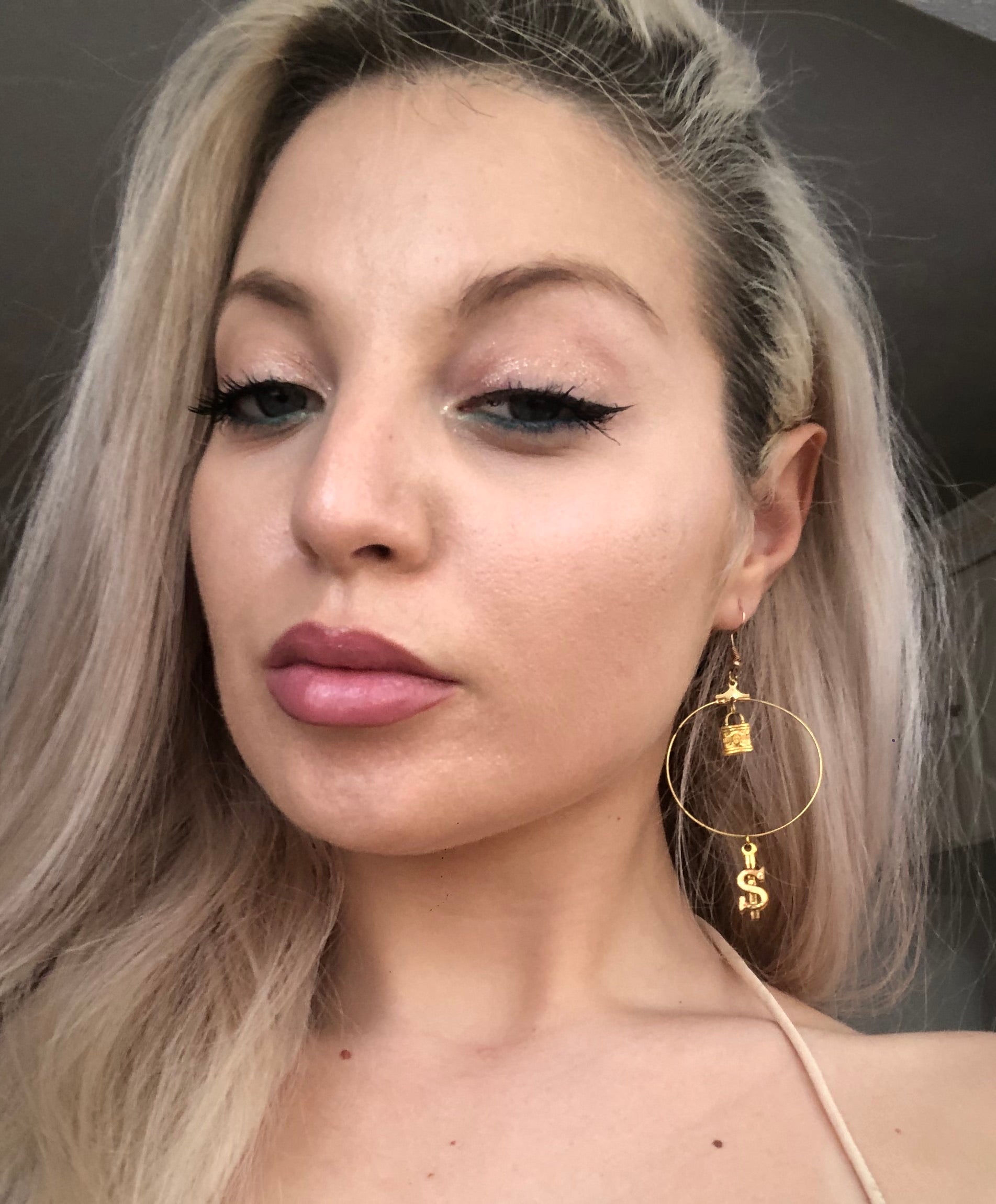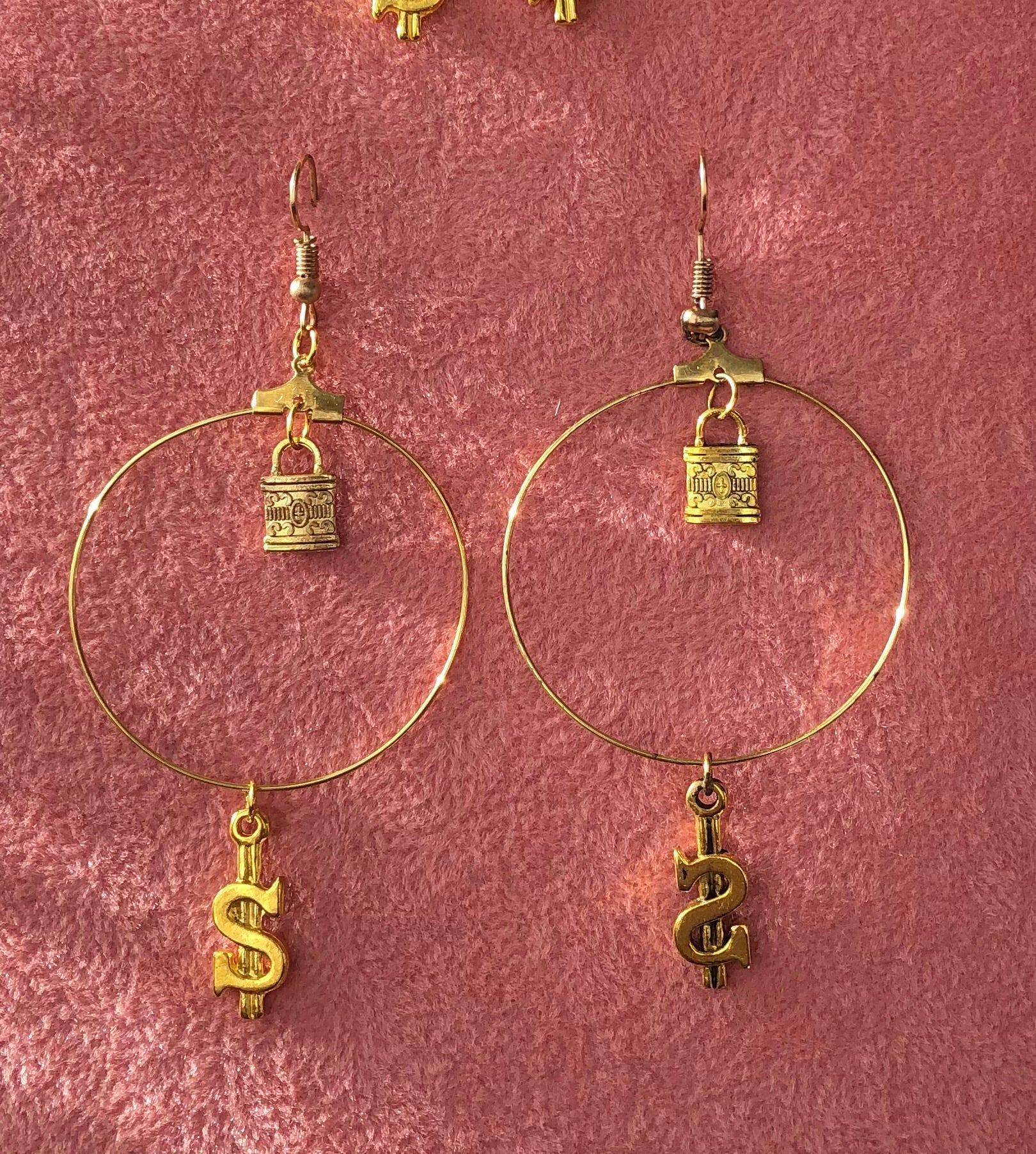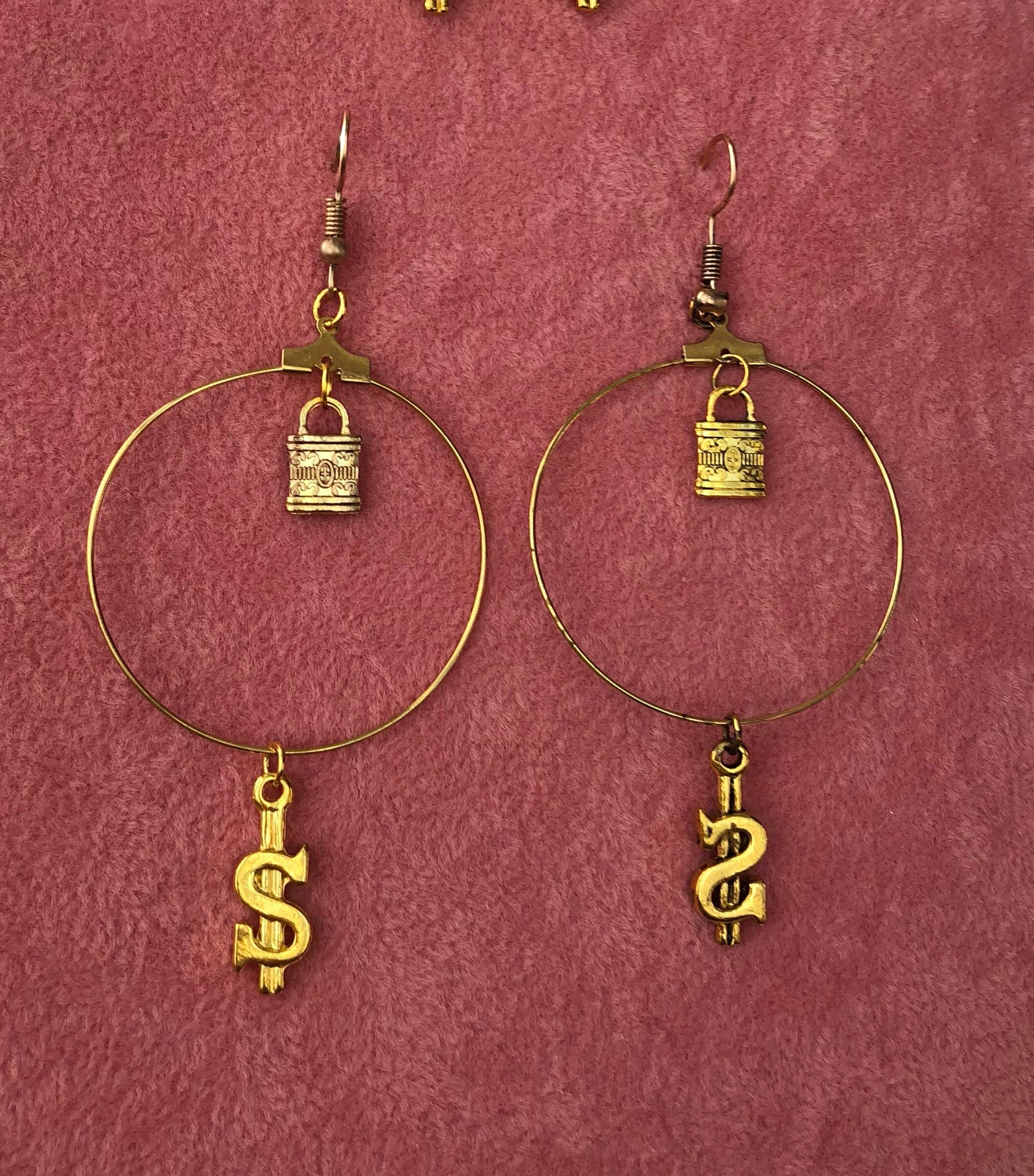 Cute handmade hoop earrings with lock and dollar sign pendant details.