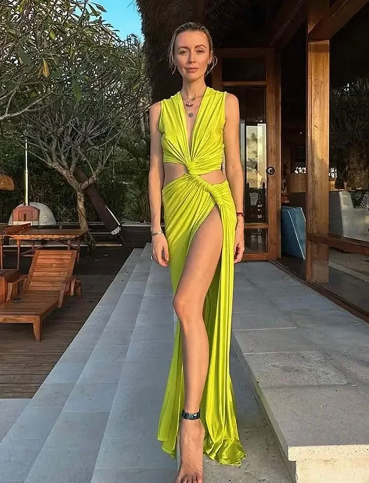 Upgrade your summer wardrobe with our sexy cut out maxi dress. The bold lime green/yellow color will make you stand out while the cut out design adds a touch of sultry elegance. Perfect for a day at the beach or a night out, this dress will make you feel confident and stylish.