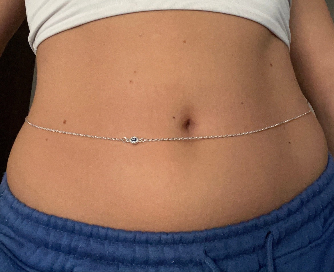 Beautiful handmade belly chain in silver with cute evil eye pendant detail.
