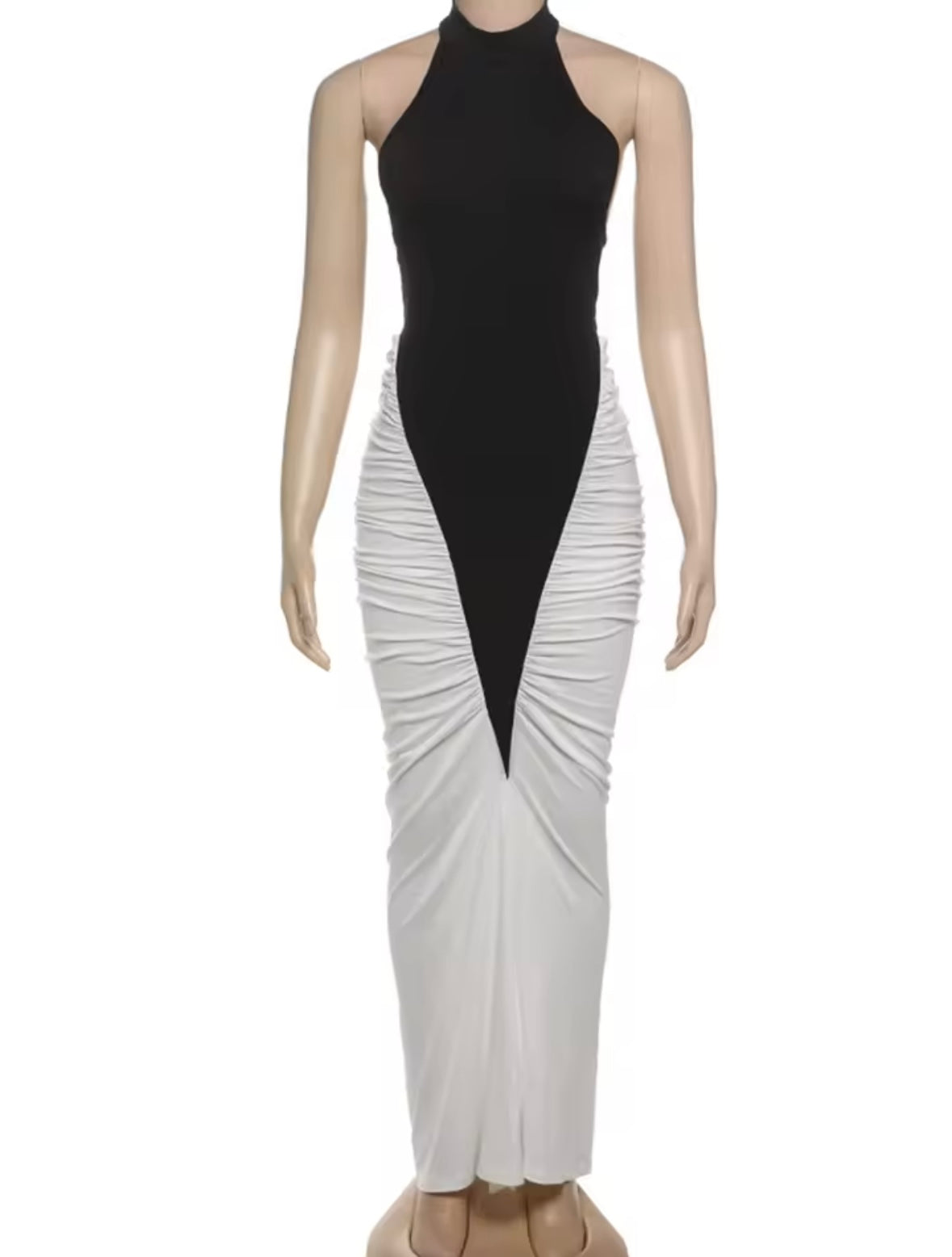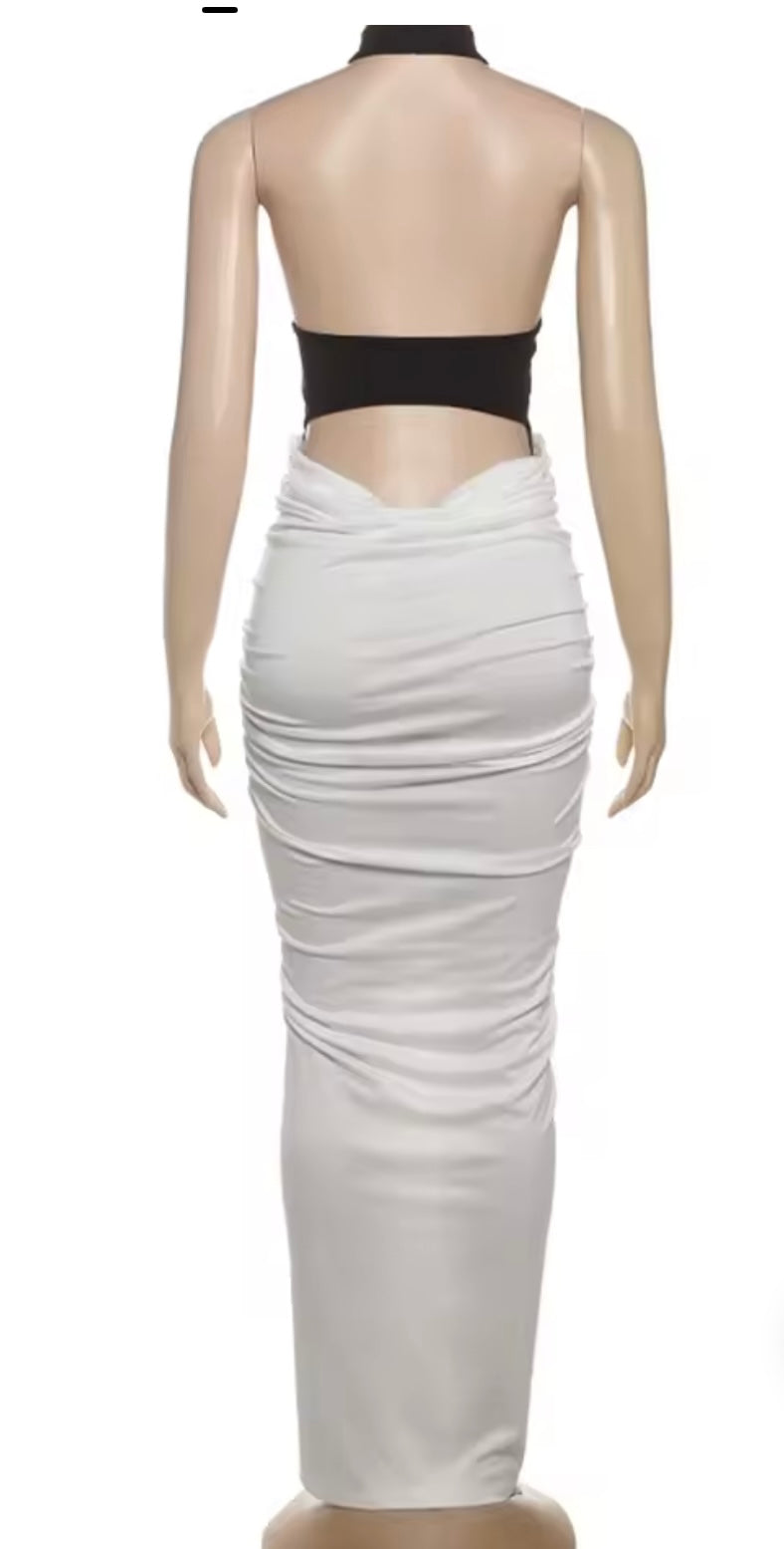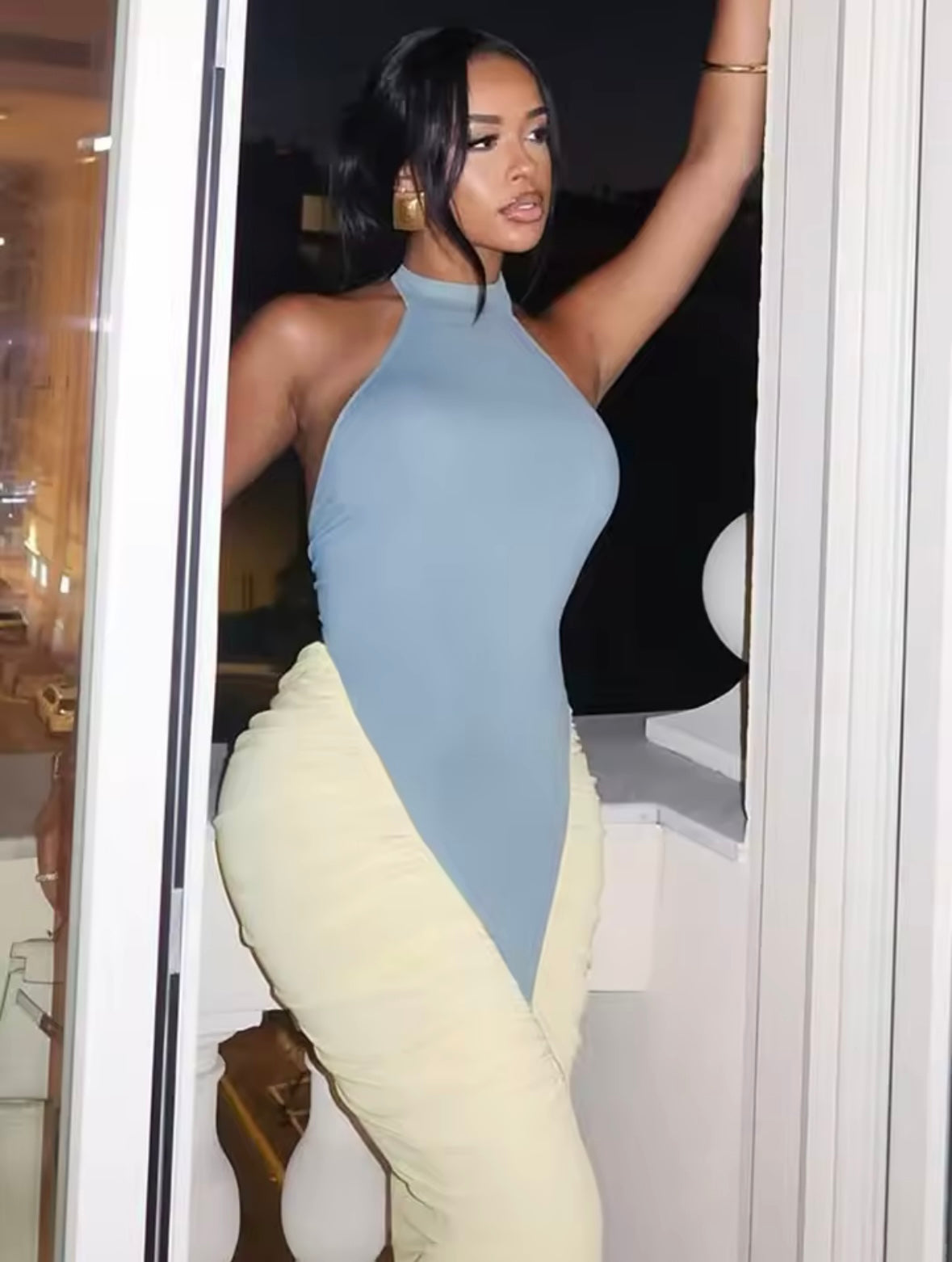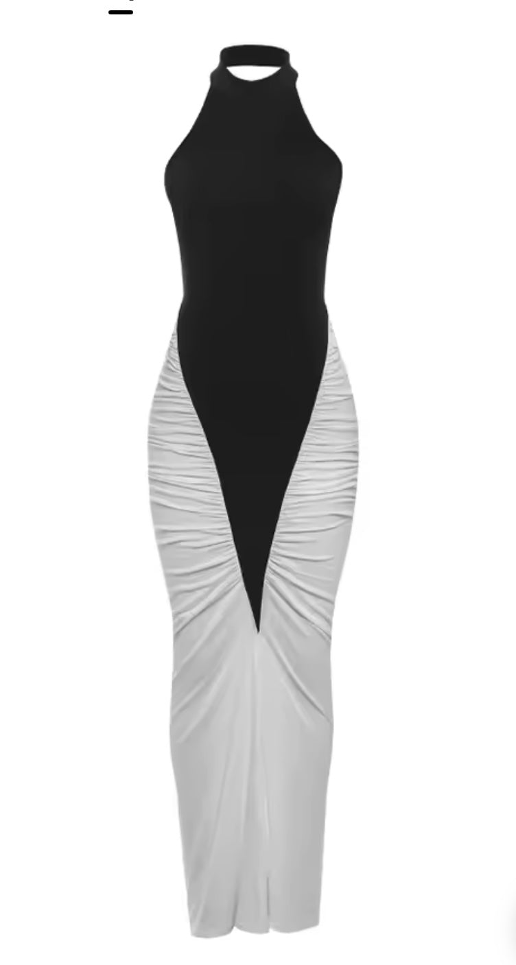 This two tone maxi dress combines style and comfort with its unique cut out back design. Made with high-quality material, it offers a flattering fit and a fashionable look. Perfect for any occasion, this dress is a must-have addition to your wardrobe.