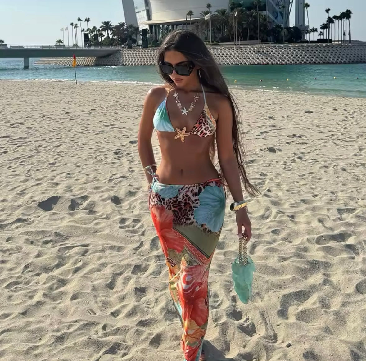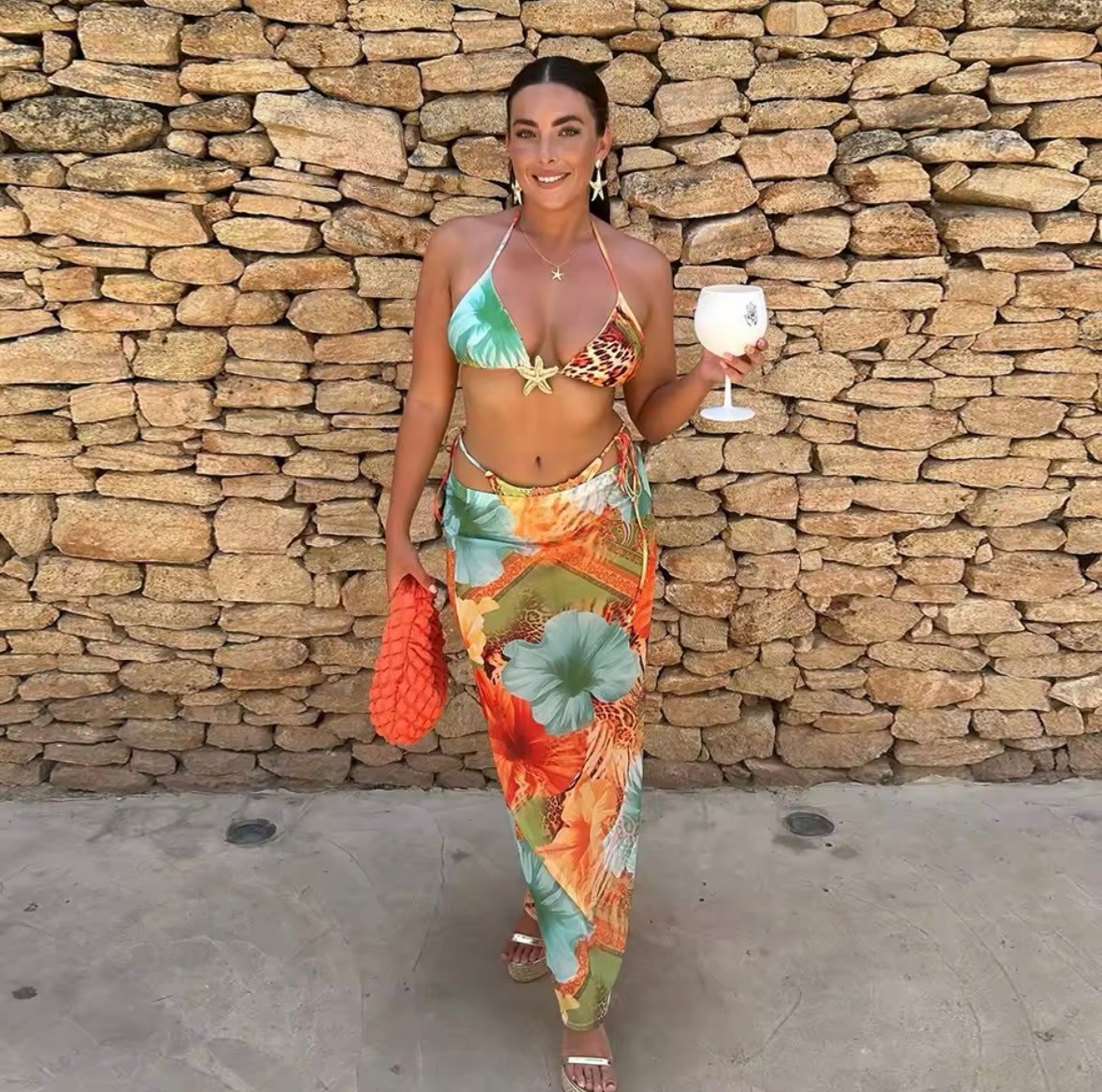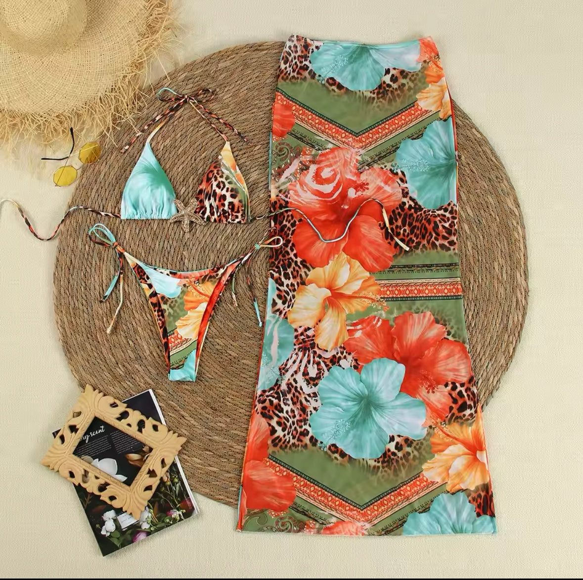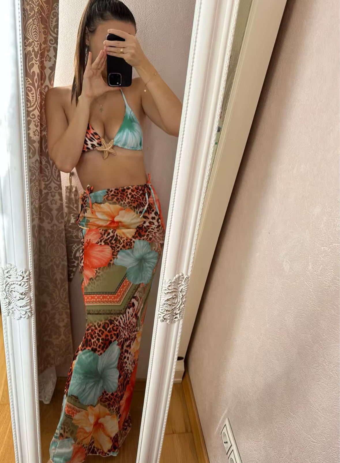 This Tropical 3 piece co ord set features a vibrant tropical print that will transport you to paradise. The set includes a stylish bikini set and a flowy maxi skirt, providing endless outfit possibilities. Made with high-quality materials, this co ord set offers both comfort and style for your summer wardrobe. Perfect for any beach vacation or tropical getaway.
