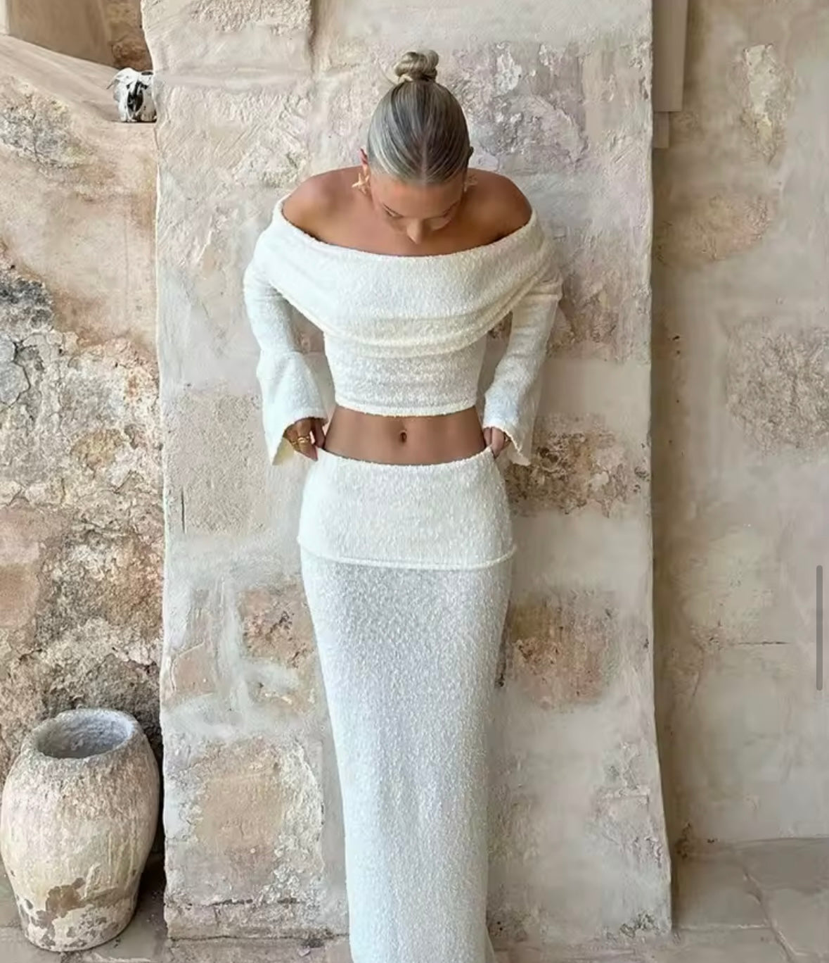 This White knit co ord set features a matching top and bottom set that is crafted from a soft and comfortable knit material. Perfect for any casual occasion, this set offers both style and comfort. Elevate your wardrobe with this versatile and timeless co ord set.